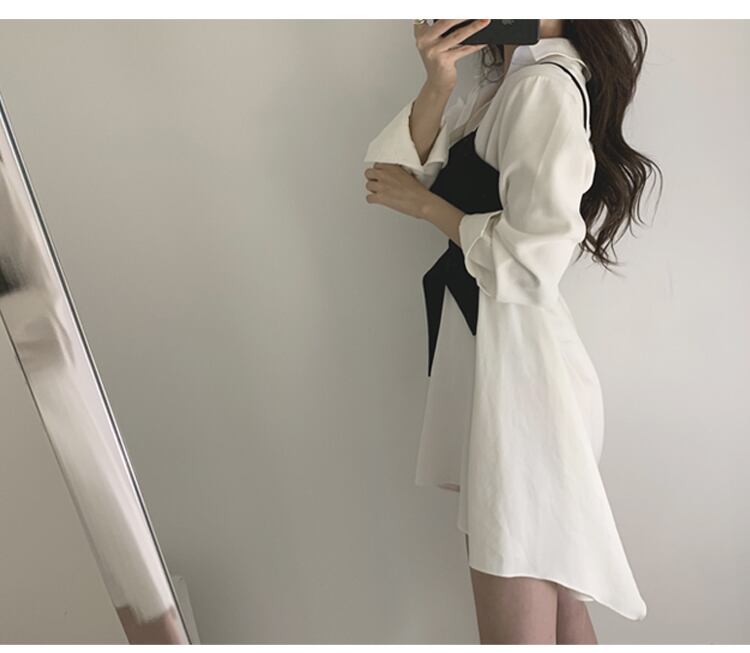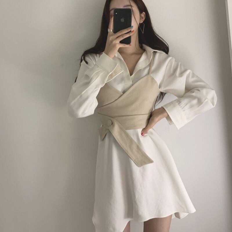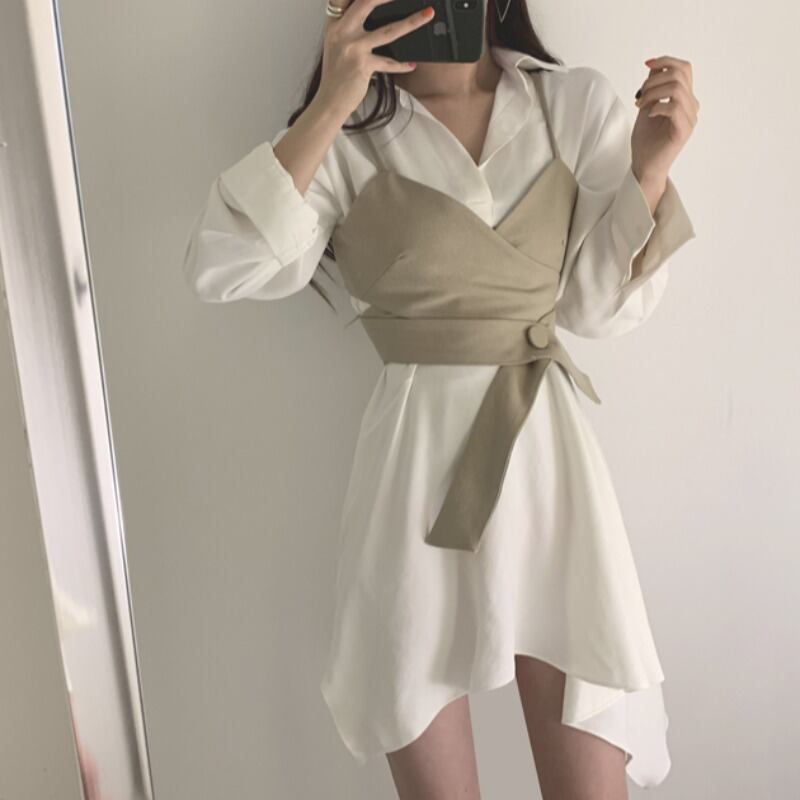 OL気質 シックな白ラペルシャツワンピース イレギュラー ミニ 長袖 ベスト スリング キャミソール トップス 秋 ワイルド ロング ホワイト オータム 秋物 asa27222535727