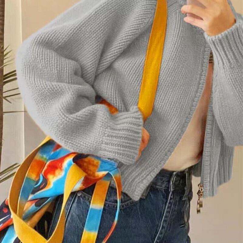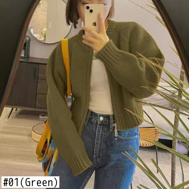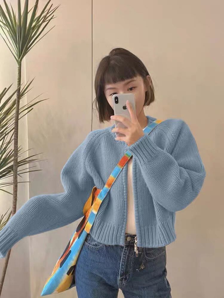 無地 クロップド カーディガン プレッピー スタイル セーター セーター プル O ネック パフ ジッパー カーディガン ニット ジャケット Oネック ソリッドカラー asa39972909663