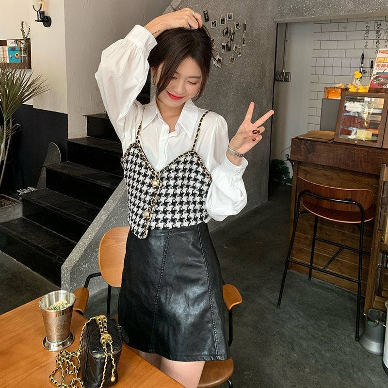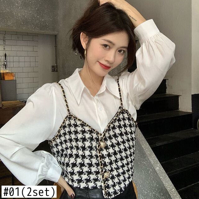 キャミソール ハウンドトゥース ベスト デ モーダ 春 ホワイト シフォン シャツ レディース 2点セット トップス ブラウス スプリング 春物 asa54132788567