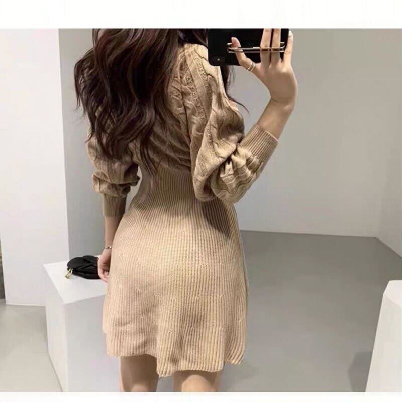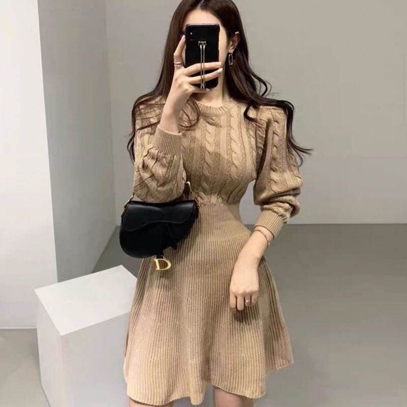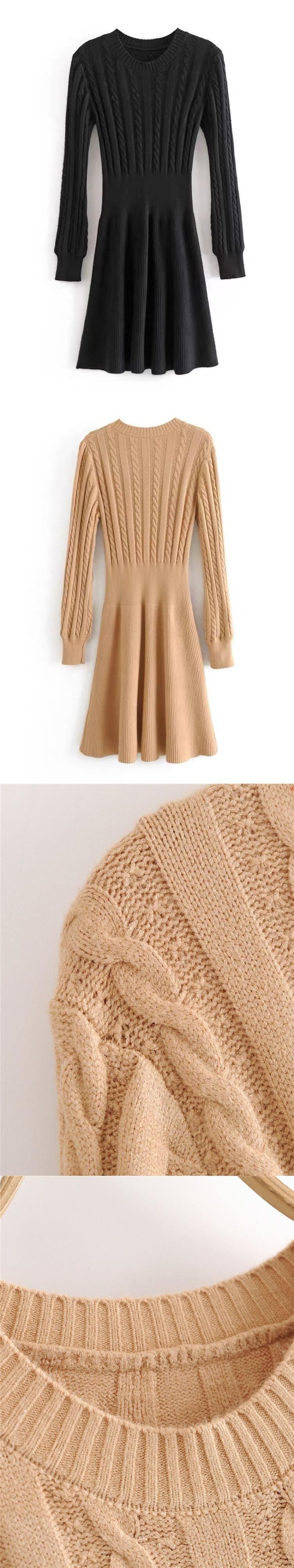 AラインウエストOネック黒ツイストセータードレスミニレトロ秋冬ドレスVestidos服プリーツニット ブラック オータム 秋物 ウィンター 冬物 asa64669809847