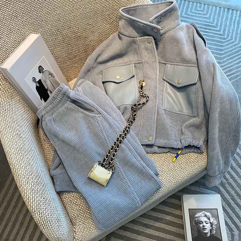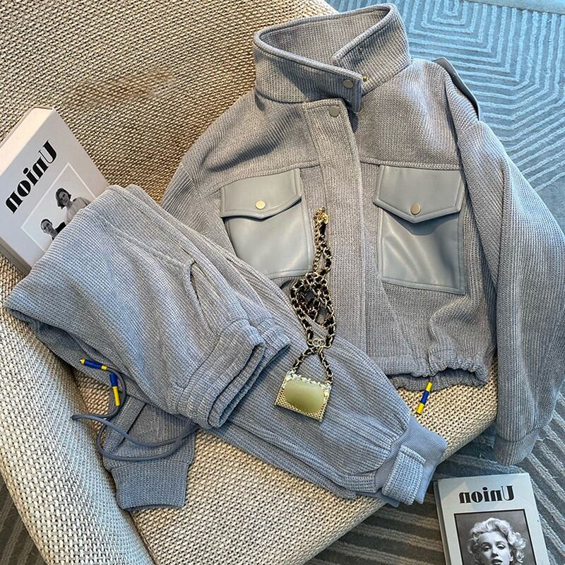 プレッピースタイルボンバージャケットワイドレッグパンツセットスウェットパンツスタンドスウェット女性春秋ルーズジップコート シャツ スプリング 春物 オータム 秋物 ワイドパンツ asa47142317747