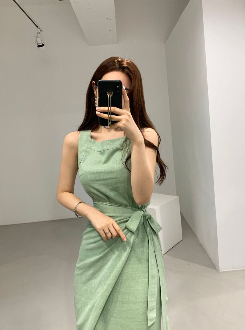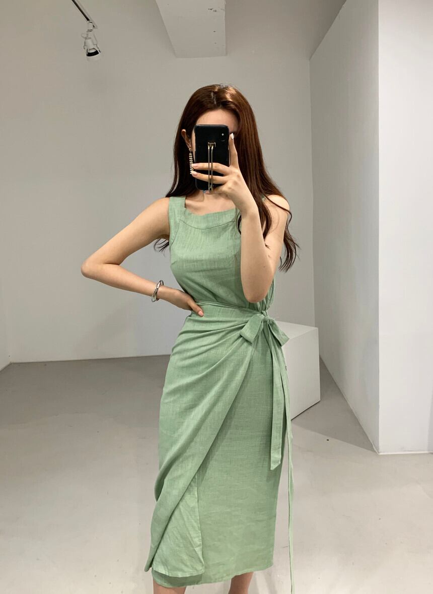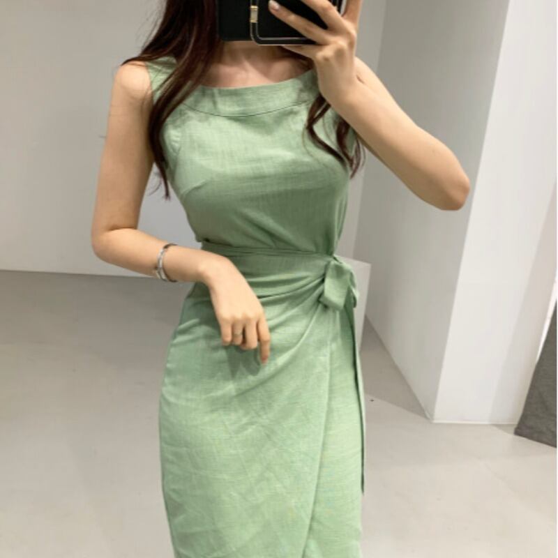 シックなラップ ワンピース スプリット ウエスト スリム グリーン スクエア ネック ノースリーブ コットン リネン ドレス スパゲッティ ストラップ バンデージ ドレス スクウェア asa99213035247