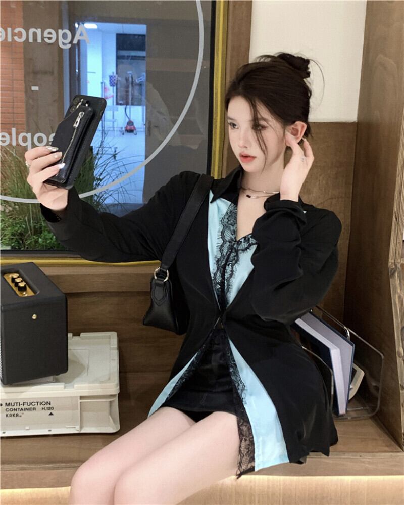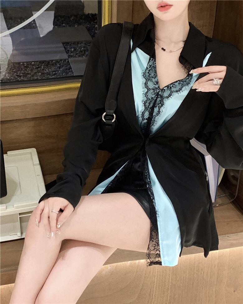 コントラストレトロセクシーな黒のレースのシャツ女性スリムスーツブラウス春 Roupas 偽 2 トップス女性シャツ ブラック スプリング 春物 asa17509586178