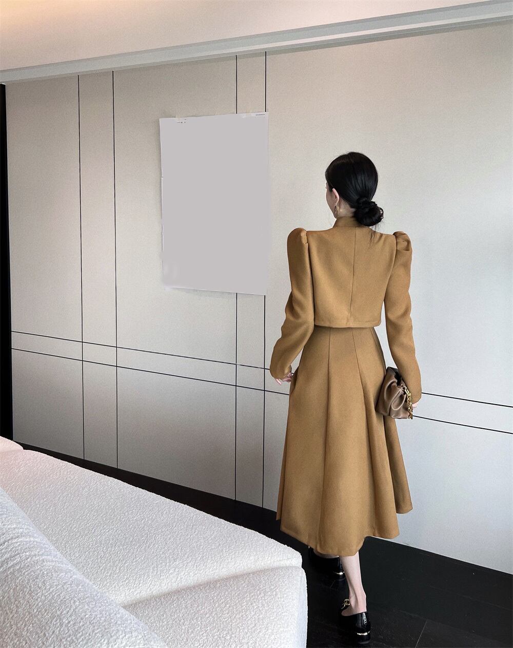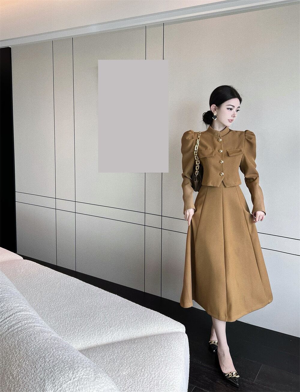 秋カーキパフスリーブジャケットショートシングルブレストシャツコート服スカートスーツ 2 点セットレディース衣装 asa70436675639
