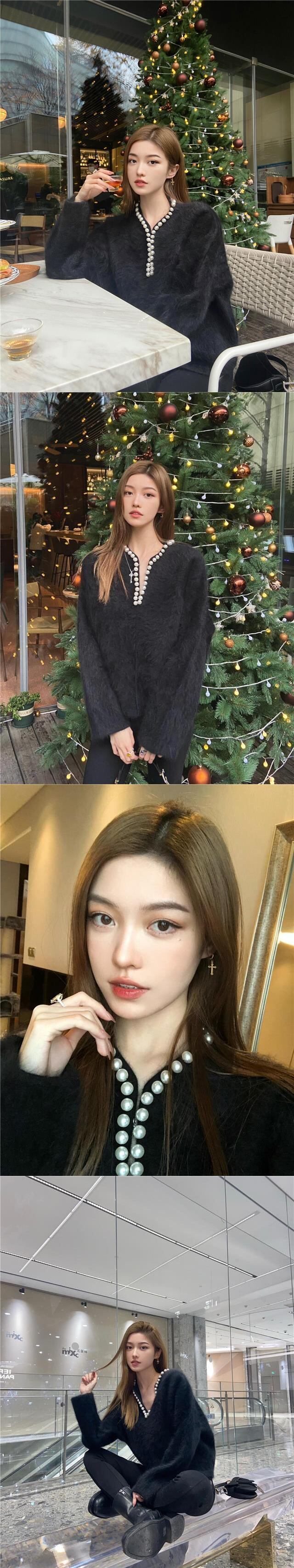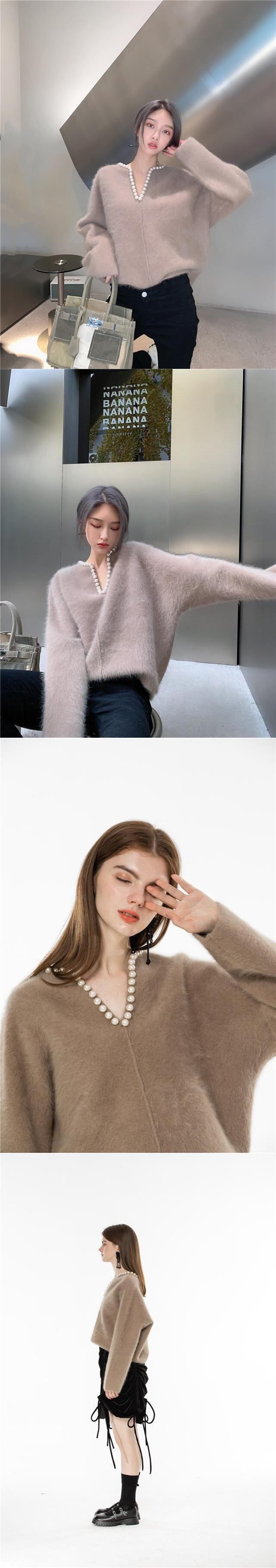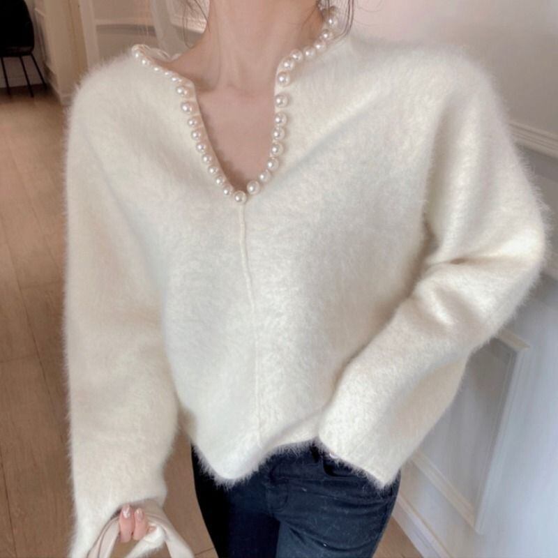 ミンクカシミヤ V ネックホワイトパールセーターの女性の冬のビーズのセーター Sueter フリーストップニットコート ウィンター 冬物 Vネック 真珠 asa25209938254