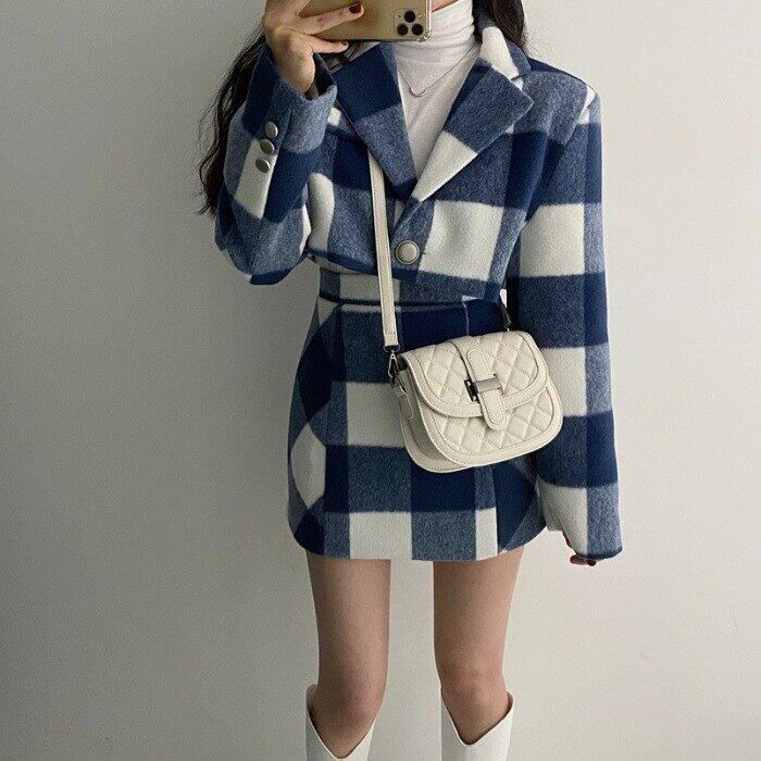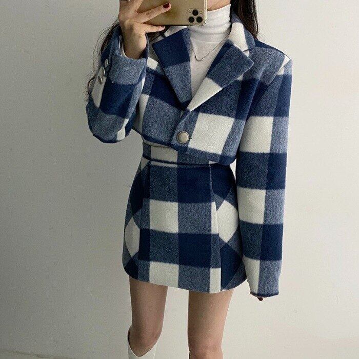 シングル ボタン ブルー ホワイト チェック柄ウール コート クロップ ノッチ付き長袖トップ セクシー ウエスト チェック柄スカート OL 秋セット ロング オータム 秋物 asa9315578717
