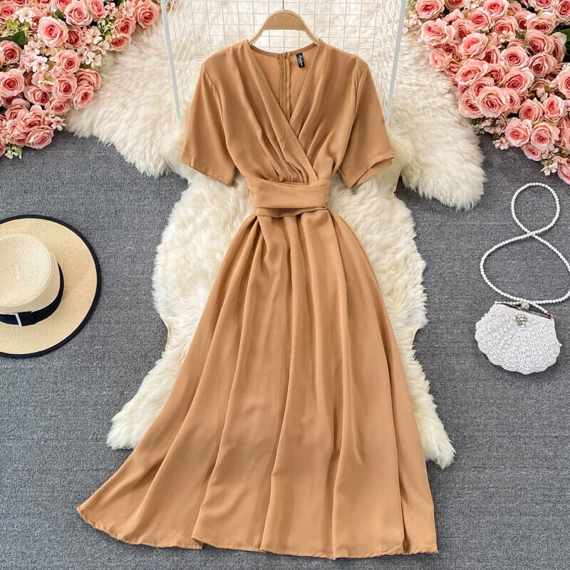 ドレス Vestido 自由奔放に生きるビーチセクシーな V ネック半袖サマードレス A ラインロングプリーツ女性ドレスワンピースジッパー ショート ハーフスリーブ 夏物 Vネック Aライン asa10501418397