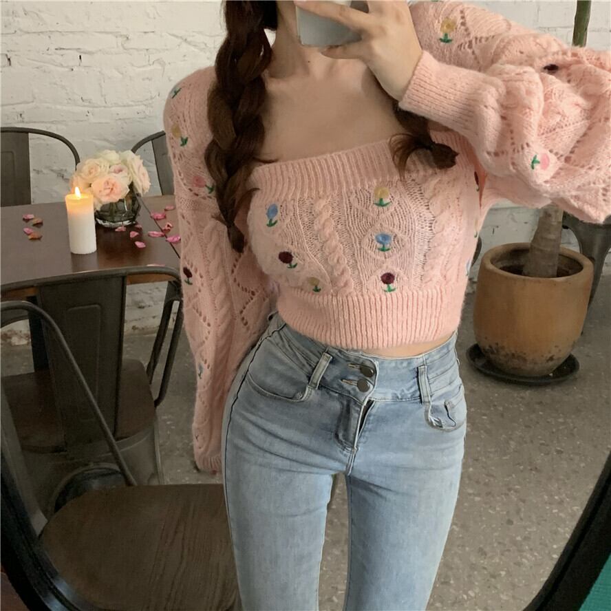 セクシーなキャミソール トップス優しい甘い女の子ショート衣装ピンク V ネック セーター花柄刺繍ニット ジャケット 2 点セット 大人ガーリー スウィート キュート カジュアル Vネック asa78381942789