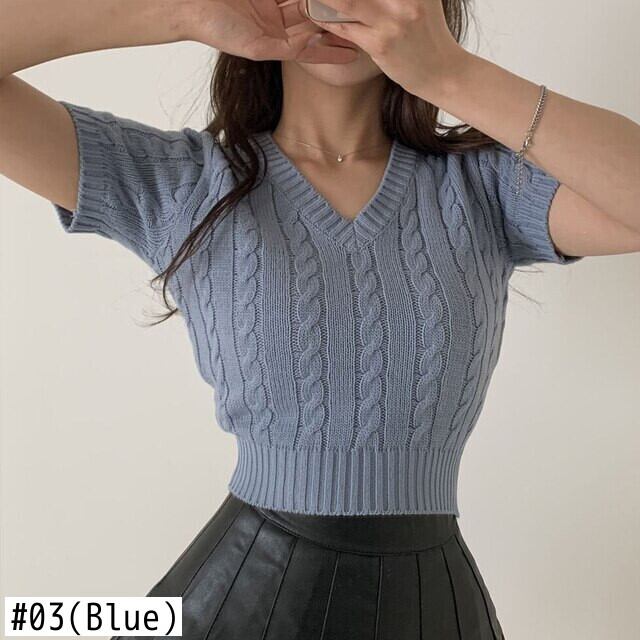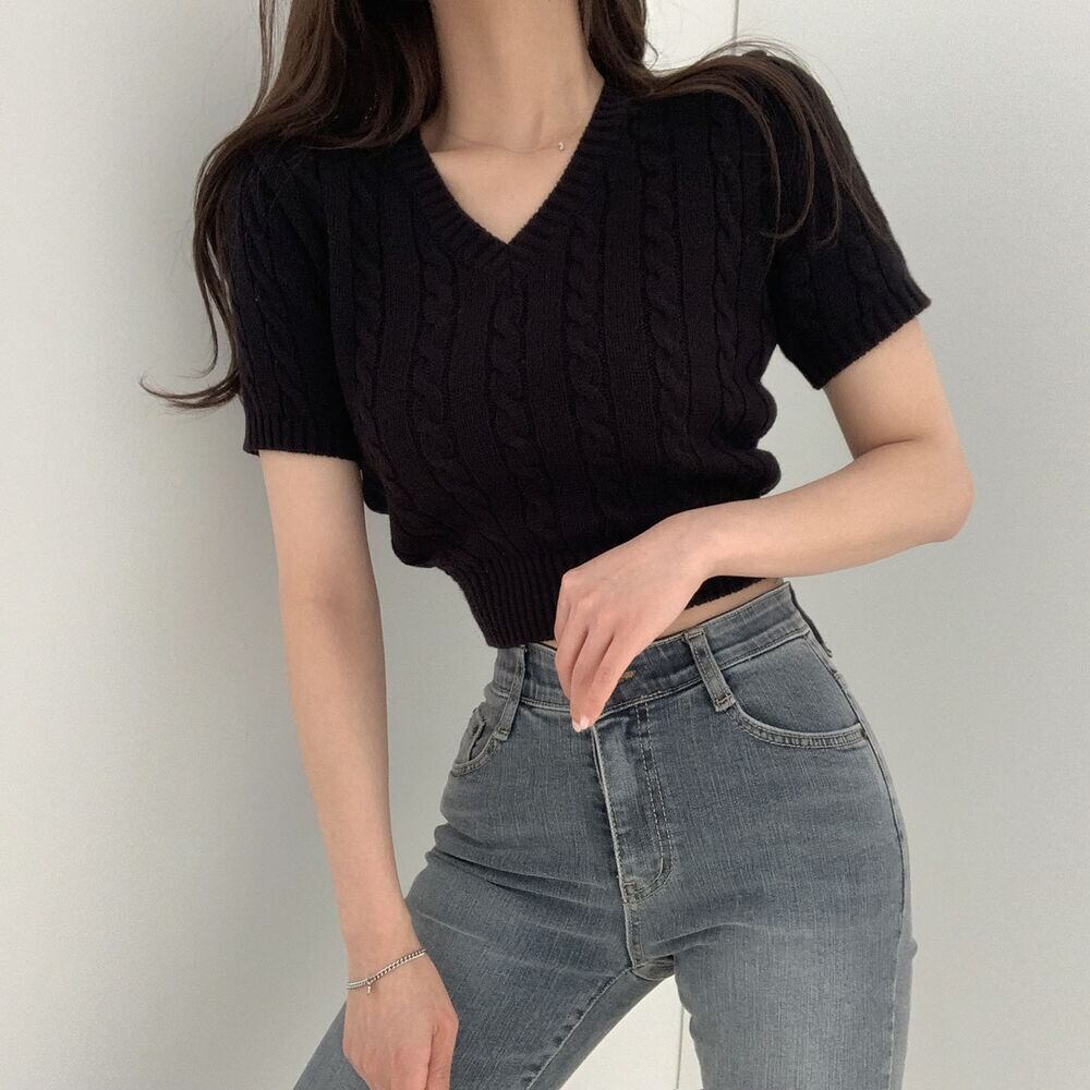 V半袖白ツイストセーター女性ジャージーセータースリムクロップトップス気質春ニットセーター野生 ショート ホワイト ハーフスリーブ スプリング 春物 asa25043377861