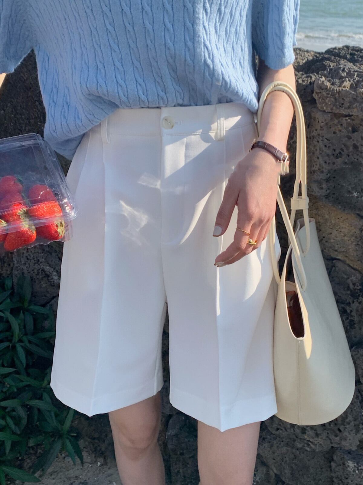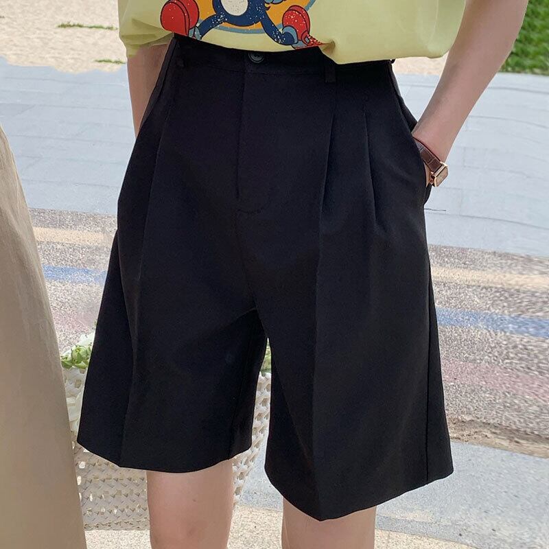 ブラック 膝丈 ショートパンツ スーツ ワイルド ウエスト ボタン ウエスト ポケット 無地 ストレート ワイドレッグ パンタロン コルトス デ ショーツ ブルマー ワイドパンツ ソリッドカラー asa57593010613