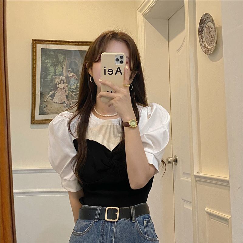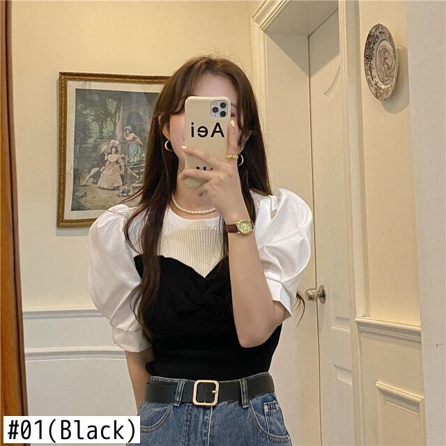 フレンチコントラストスプライスコートスタイル夏スリムフィットクロップトップスパフ半袖女性 Tシャツニットシャツ Tシャツ ショート ハーフスリーブ サマー 夏物 asa42416396626