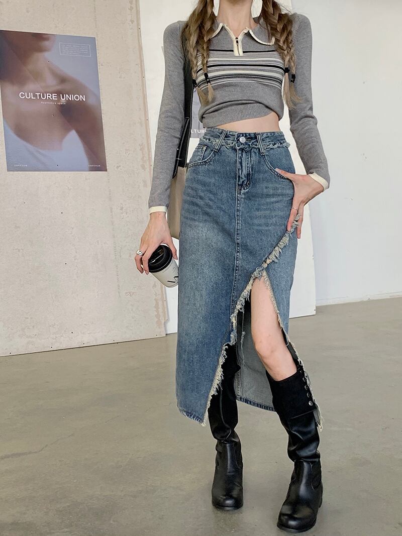 デニムスカート女性ミディペチコート A ラインセクシーなロングラップヒップ春スプリットウエストスリム段 Faldas Moda ジーンズスカート Y2k スプリング 春物 Aライン asa77886565661
