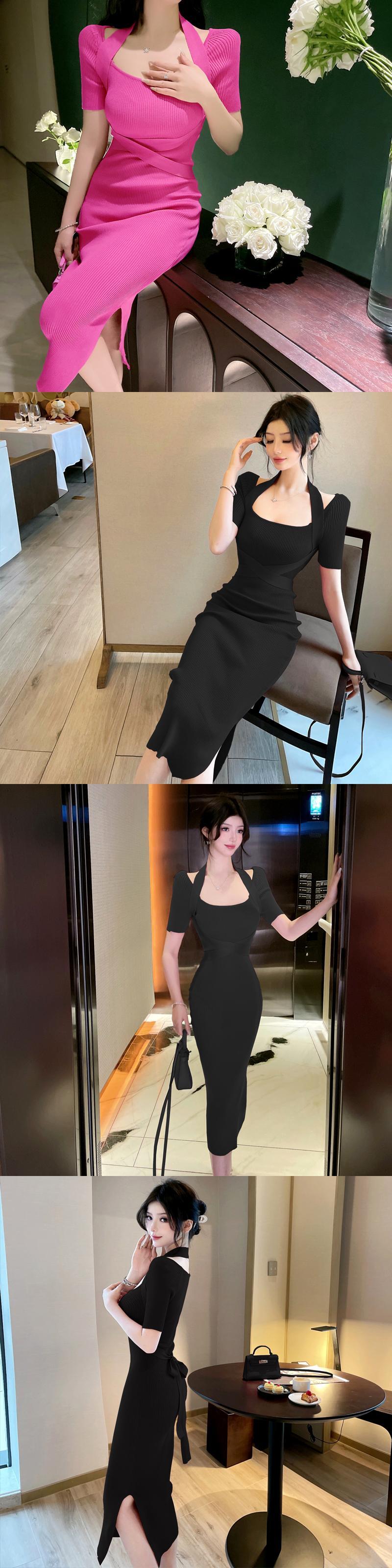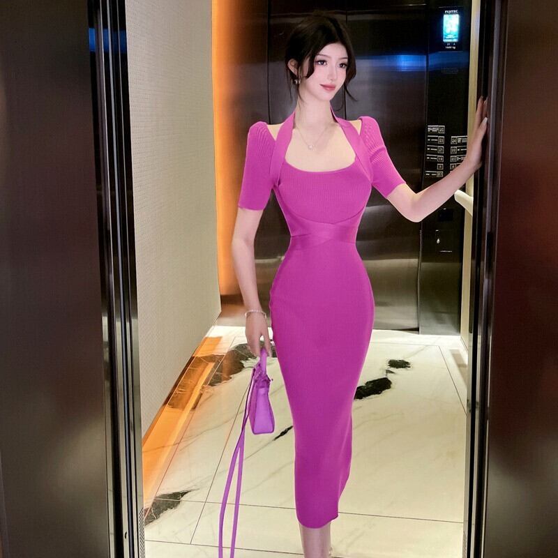 ストレッチヒップセクシーな包帯ホルター半袖ニットドレスボディコンウエスト帝国野生 Vestidos 夏の女性のドレス ショート ハーフスリーブ サマー 夏物 asa68125405730