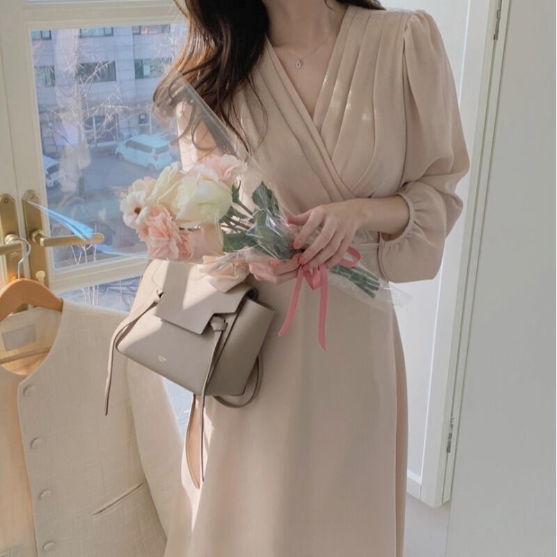 シックなスリムな気質 A ライン パフ長袖 V シフォン ドレス女性固体薄い Vestido Feminino 新鮮な甘い ロング 大人ガーリー スウィート キュート カジュアル Aライン ソリッドカラー asa18567723491