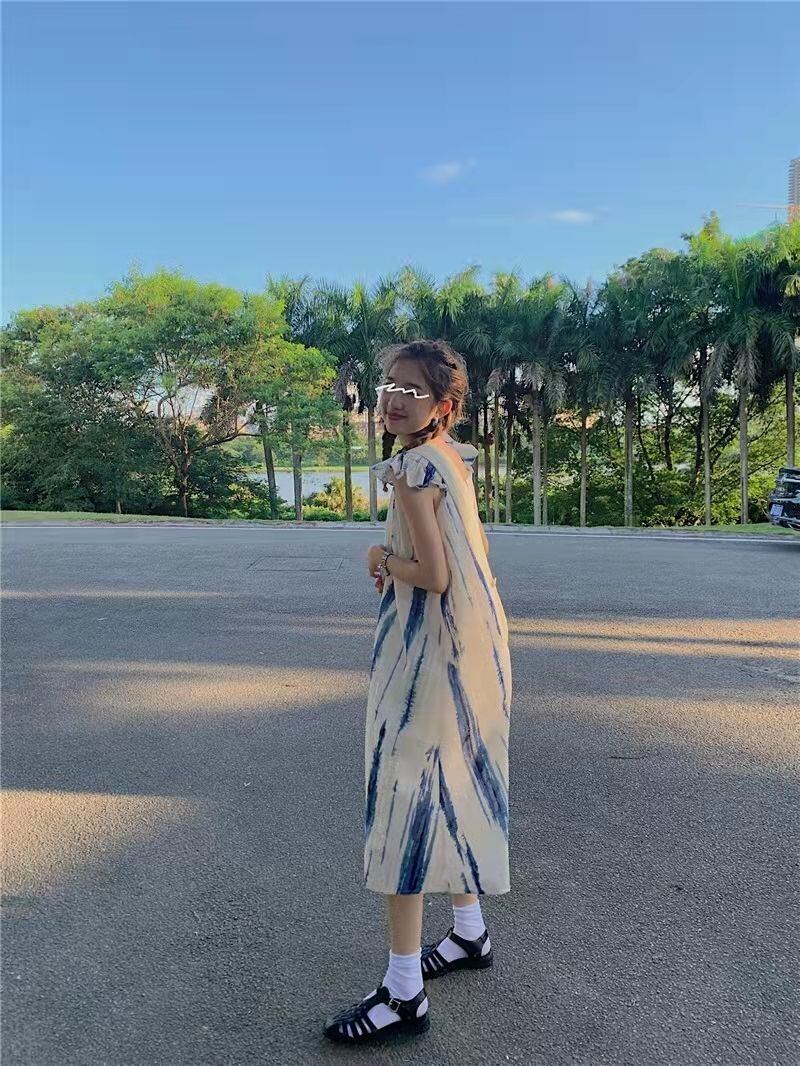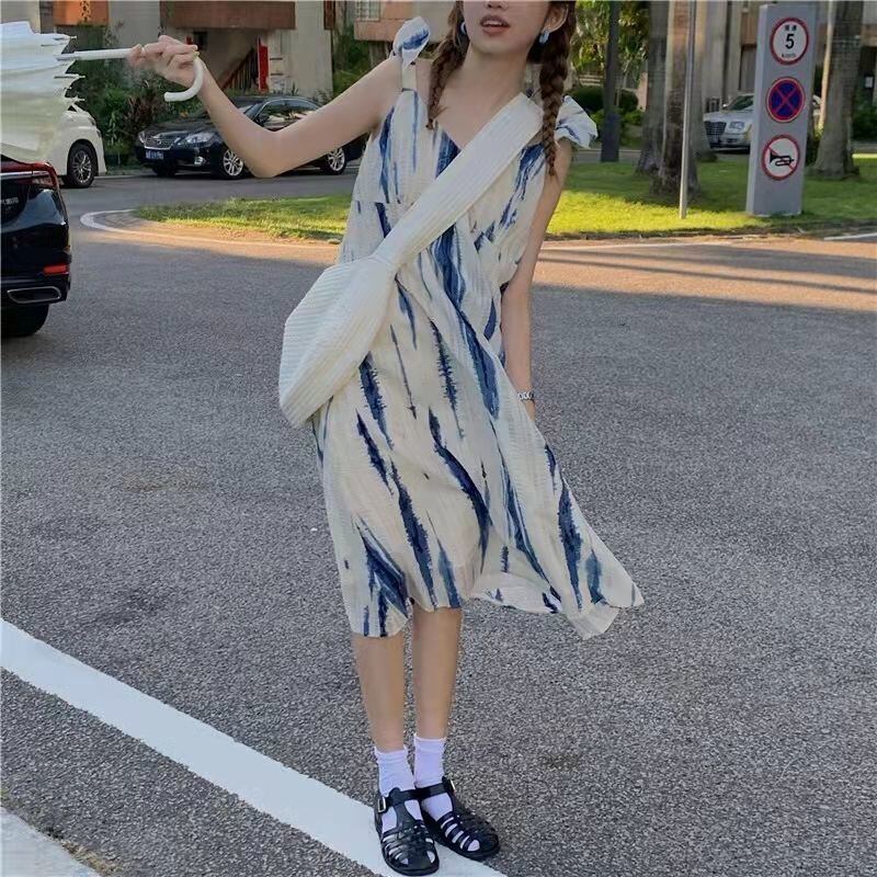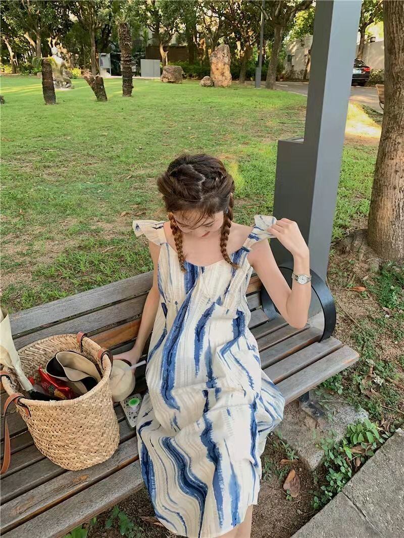 ルーズスパゲッティストラップドレスセクシーなビーチローブマキシドレス Vestidos 夏フライングスリーブブルー絞り染めドレス女性レトロ サマー 夏物 asa2125200228