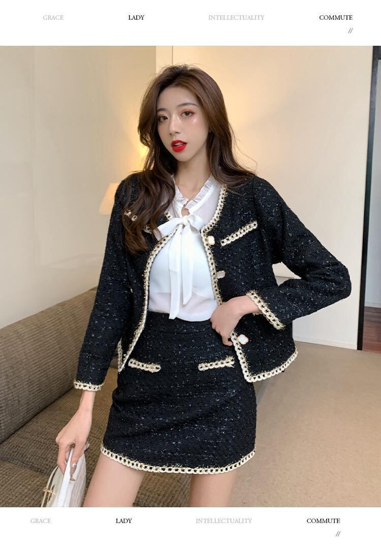小さな香りの黒ツイード コート短い秋ジャケット シックなラップ ヒップ ミニ格子縞のスカート セット 2 点セット フレンチ カーディガン ショート ブラック オータム 秋物 asa78403936925