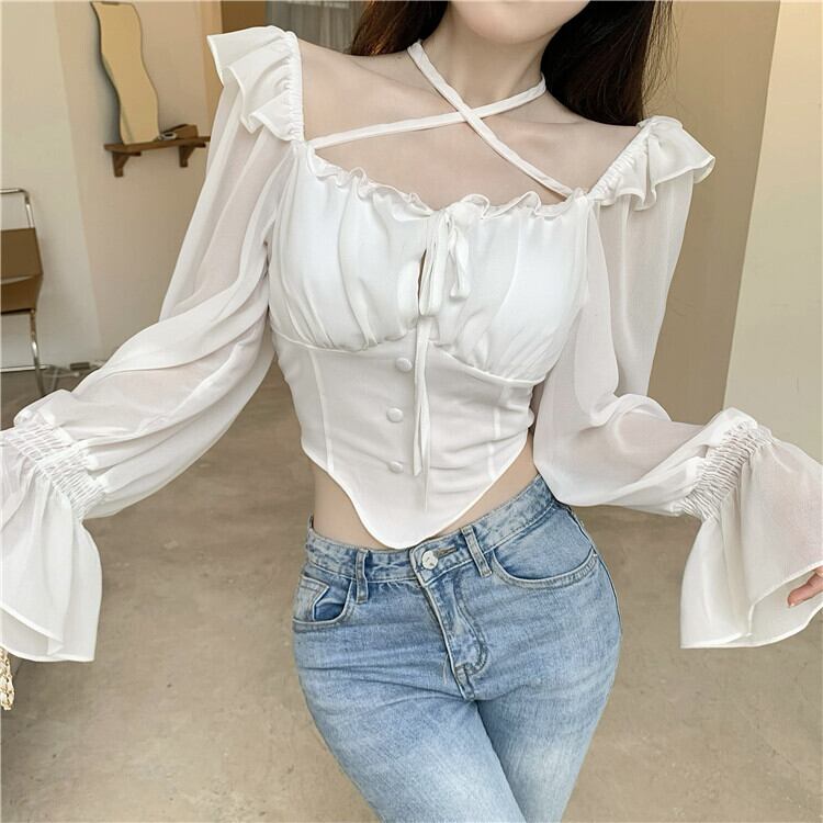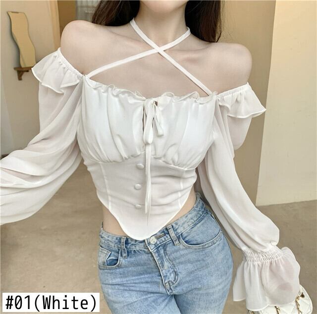 長袖フリル シフォン シャツ オフショルダー 1 スリム フィット クロップ トップ セクシーなトランペット スリーブ シャツ菌レースアップ ブラウス レトロ ロング asa89568209497