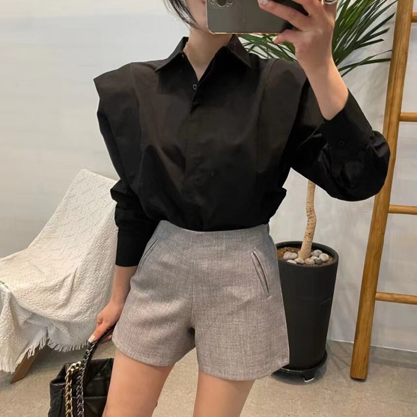 秋のレトロなシンプルなラペルフリルルーズ長袖白シャツ女性トップカーキ黒ブラウスシャツ ロング ホワイト ブラック オータム 秋物 asa25197008176
