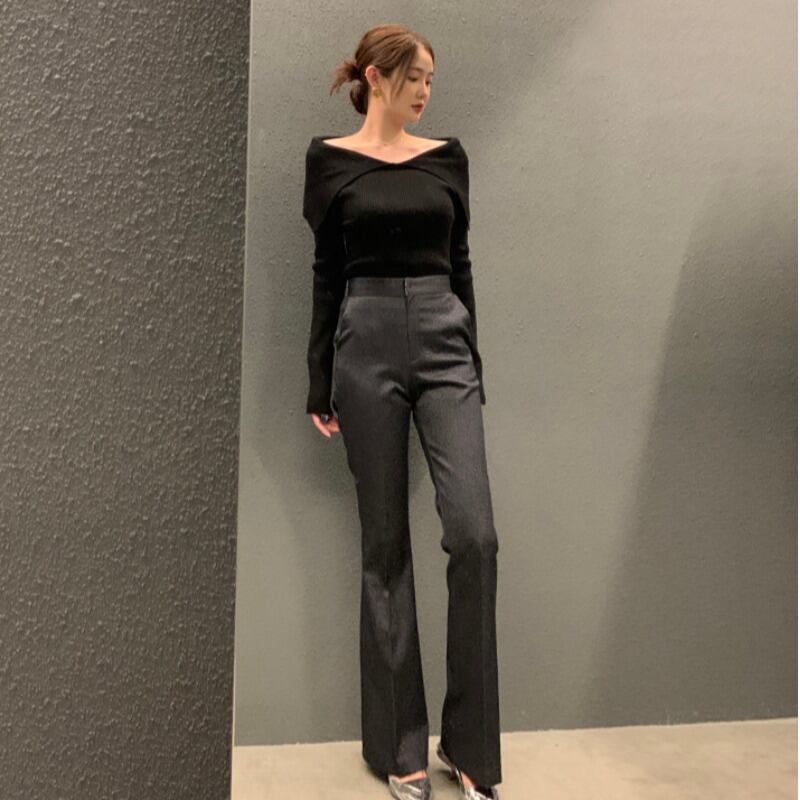 ジャンパーセータープルオーバースラッシュオフショルダーカーキセーター女性スリムラペル長袖黒セーターシャツレトロ ロング ブラック asa98604604542