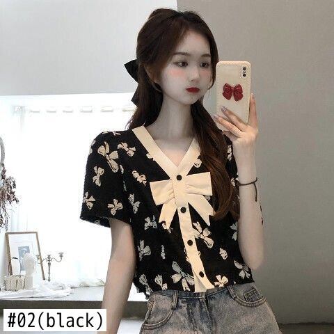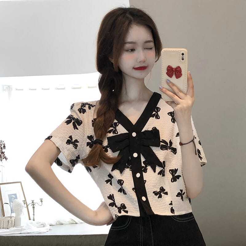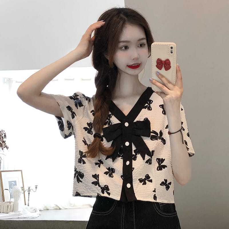 シックな V ネック弓半袖シャツ女性プリント花柄ブラウススリムクロップトップス夏のシャツ ショート リボン ハーフスリーブ サマー 夏物 Vネック asa32392352065