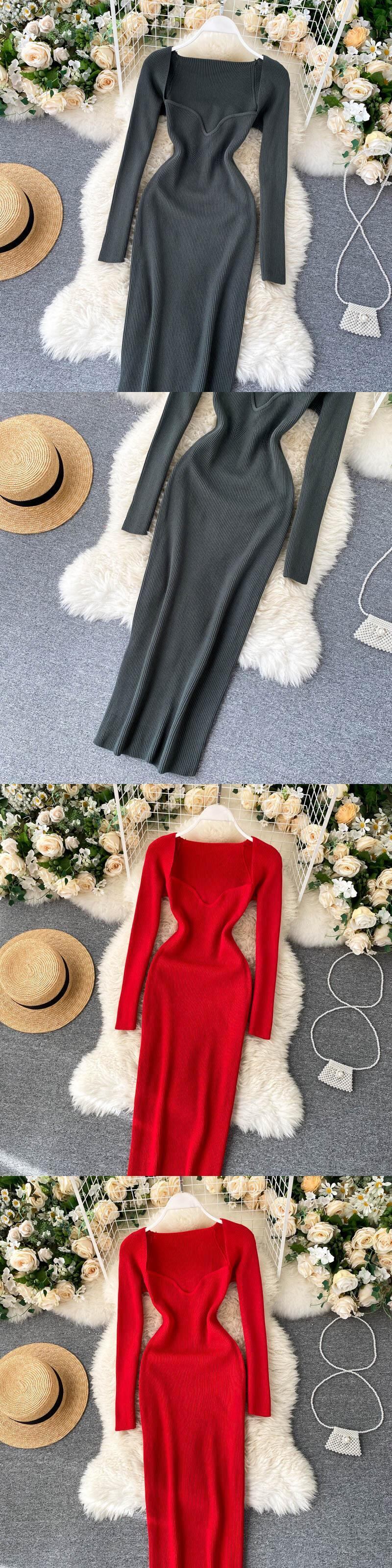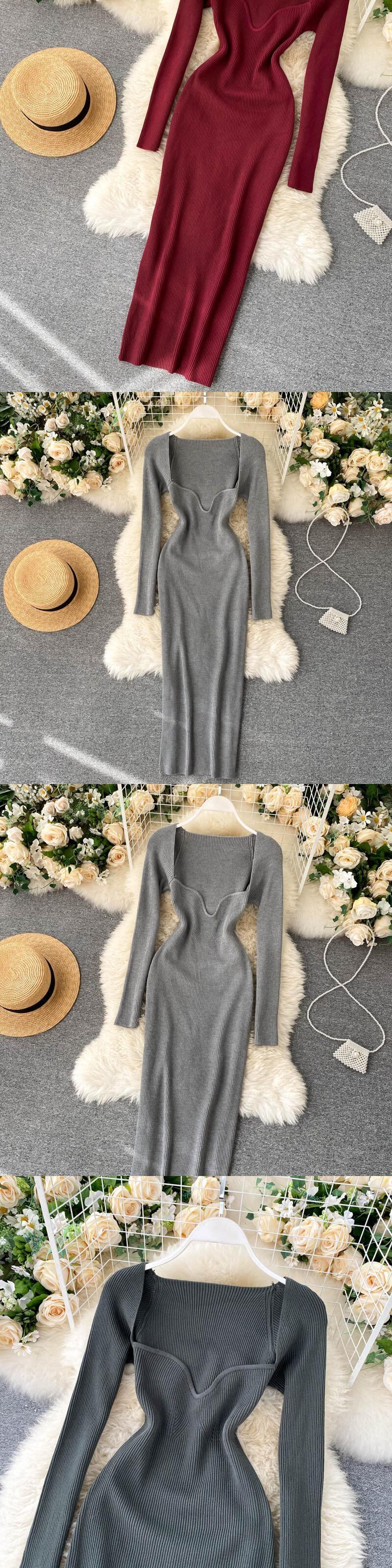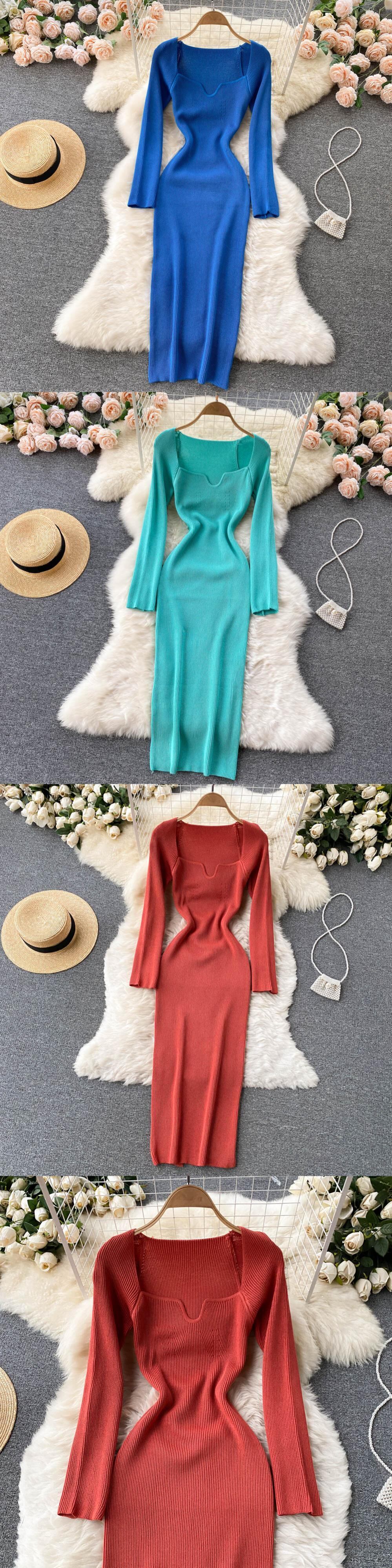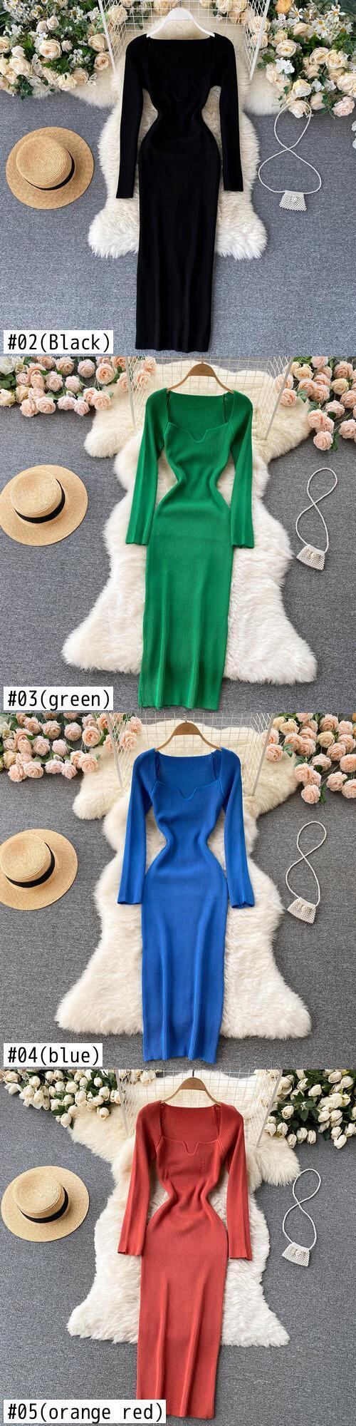 ヒップ秋冬スクエアニットドレスボディコンスリム弾性ウエスト Vestidos デフィエスタ長袖ミディ Y2k ローブ野生 ロング エラスティック 伸縮 オータム 秋物 ウィンター 冬物 スクウェア asa39535171160