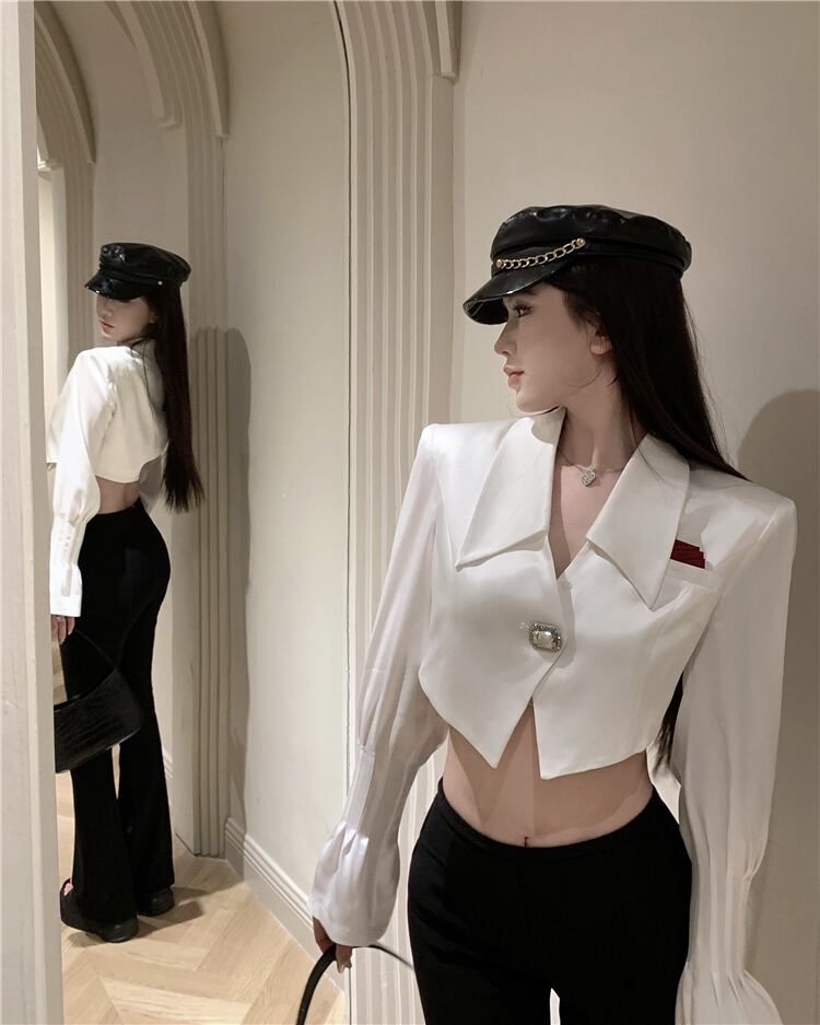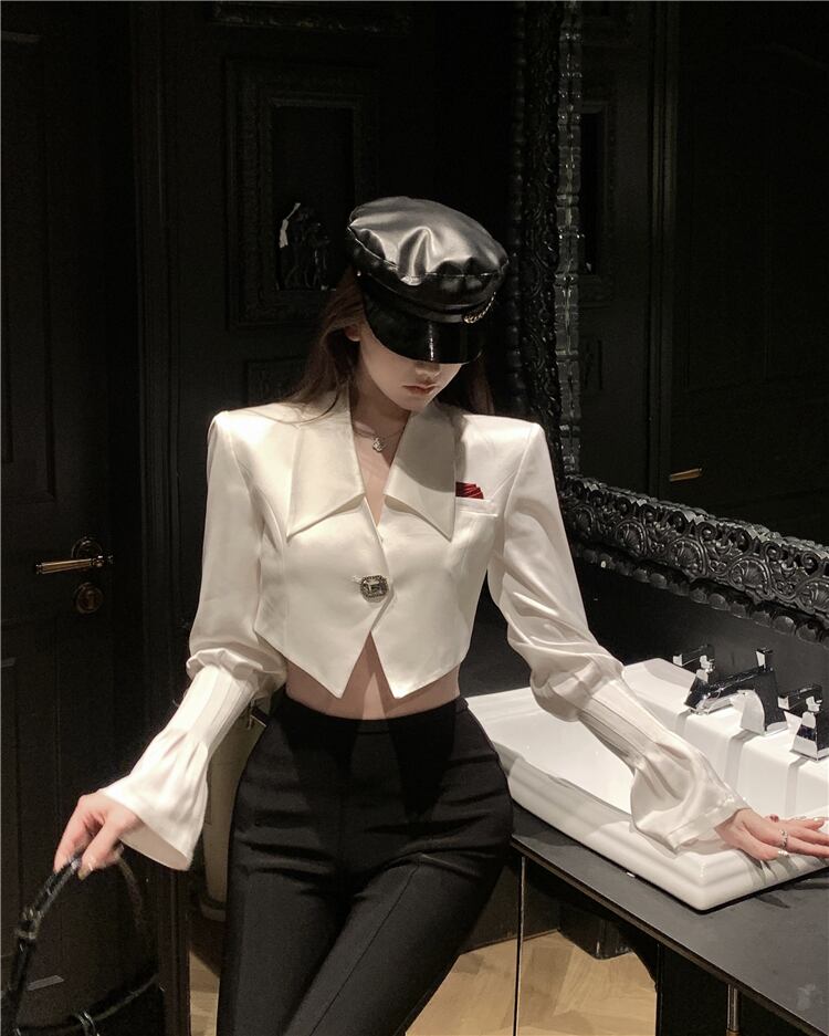 気質ショートホワイトサテンシャツ女性スーツトップ OL ブラウスプリーツシャツ Roupas s 春フレアスリーブ スプリング 春物 asa81034529880