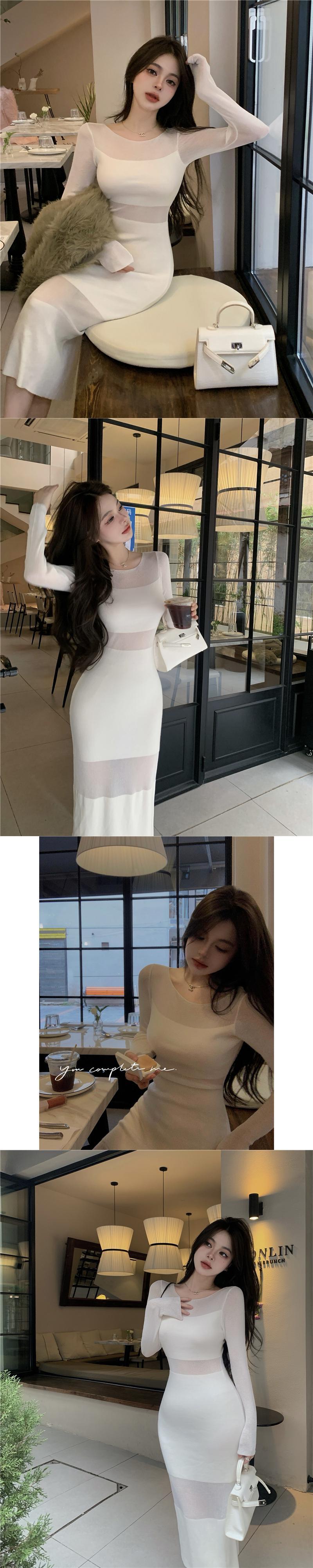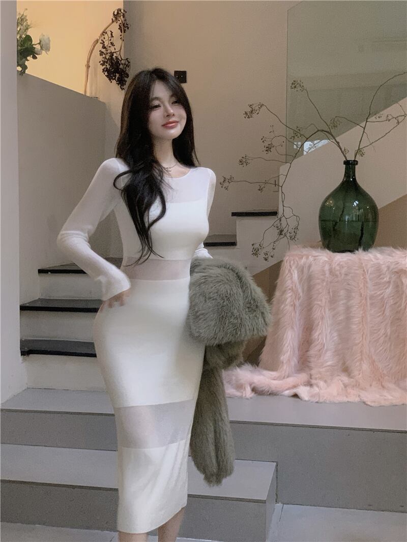 長袖ニット透視メッシュドレス女性春スリムラップヒップミディセクシーな Vestidos ロング スプリング 春物 asa96866077537