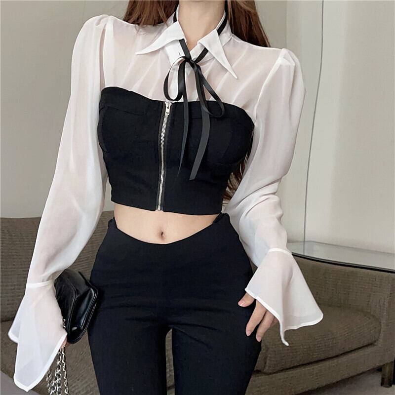 レースアップ Blusa フェイク 2 長袖シフォンシャツ女性フレアクロップトップス Roupas s 春セクシーなブラウスシャツ ロング スプリング 春物 asa87734486696