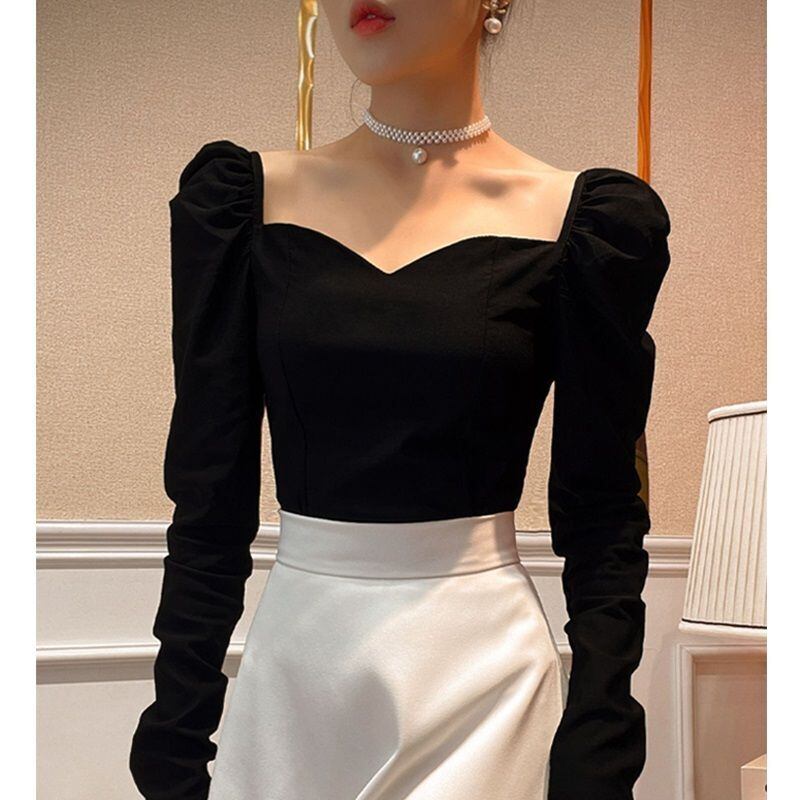 バブルスリーブ長袖トップススリムシャツ女性スクエアカラー黒 Tシャツ Y2k トップフリース Tシャツ野生特大 ロング ブラック スクウェア asa83233608681