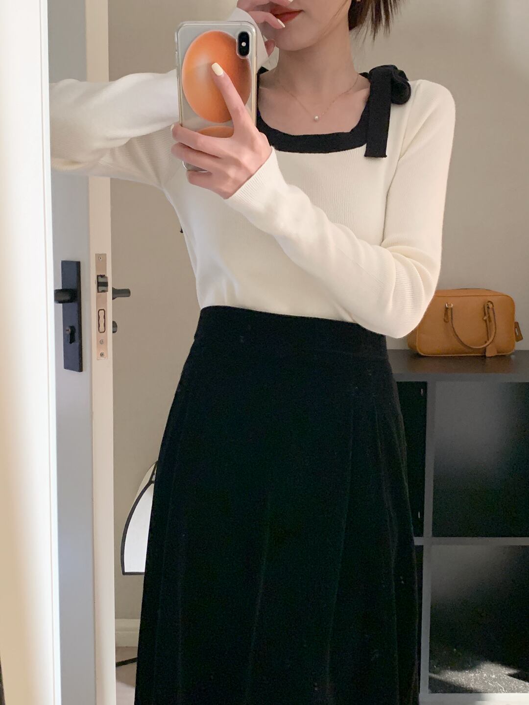 スリム弓スクエアカラー Tシャツジャージープルオーバー黒セーター女性ジャンパークロップトップスニット白ブラウスレトロシャツ ホワイト ブラック リボン スクウェア asa35925536049