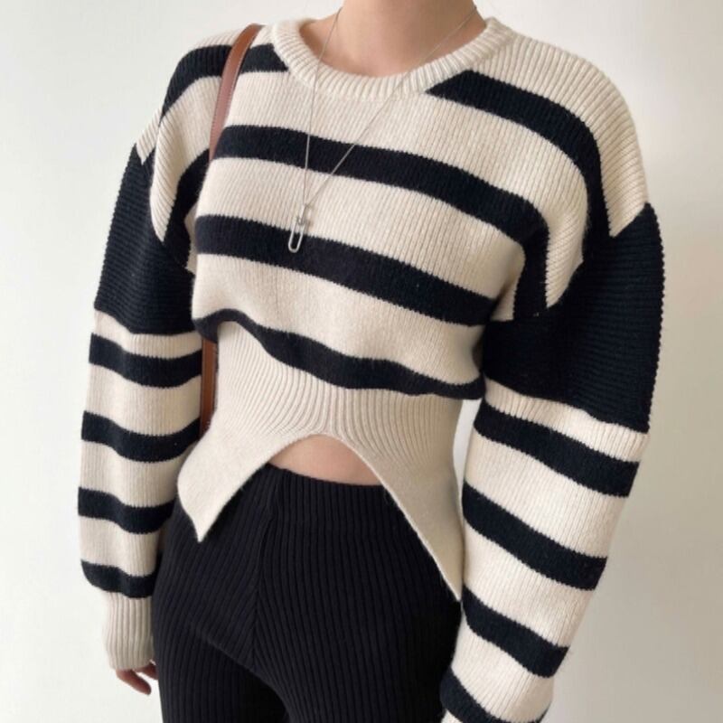 ジャンパープルオーバースリットパフスリーブクロップドストライプセーター女性セーター秋冬ニットトップシャツ女性 オータム 秋物 ウィンター 冬物 asa34185474499