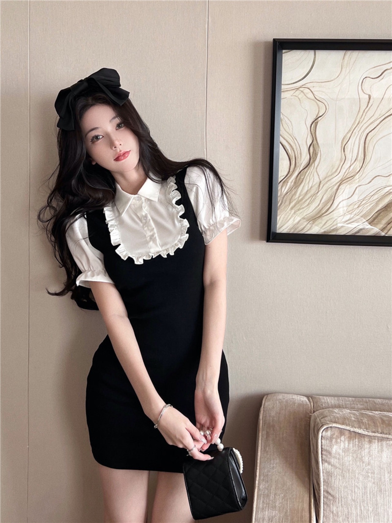 女性フェイクツーピース半袖シャツドレス春スリムウエストラップヒップセクシーな黒のミニドレス Vestidos ショート ブラック ハーフスリーブ スプリング 春物 asa85095493115