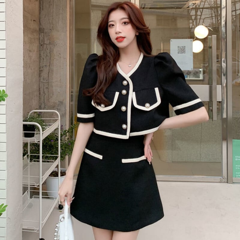 V パフ半袖カーディガンスーツクロップ黒シャツ女性ミニスカートセットスリム夏 2 点セットトップコート ショート ブラック ハーフスリーブ サマー 夏物 asa35007903507