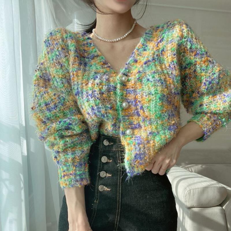 クロップド V ネック シングル ブレスト キャンディ レインボー カーディガン女性秋プル セーター ジャージー長袖セーター ニット コート ロング Vネック asa21551099312