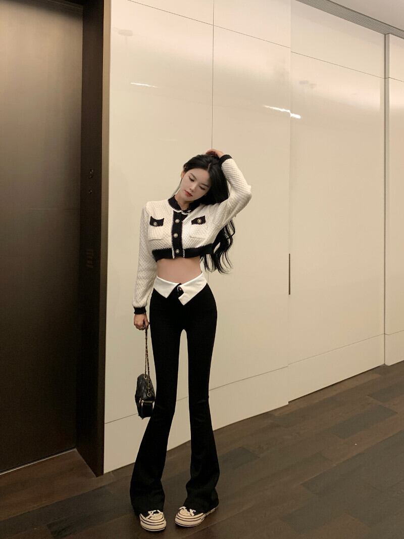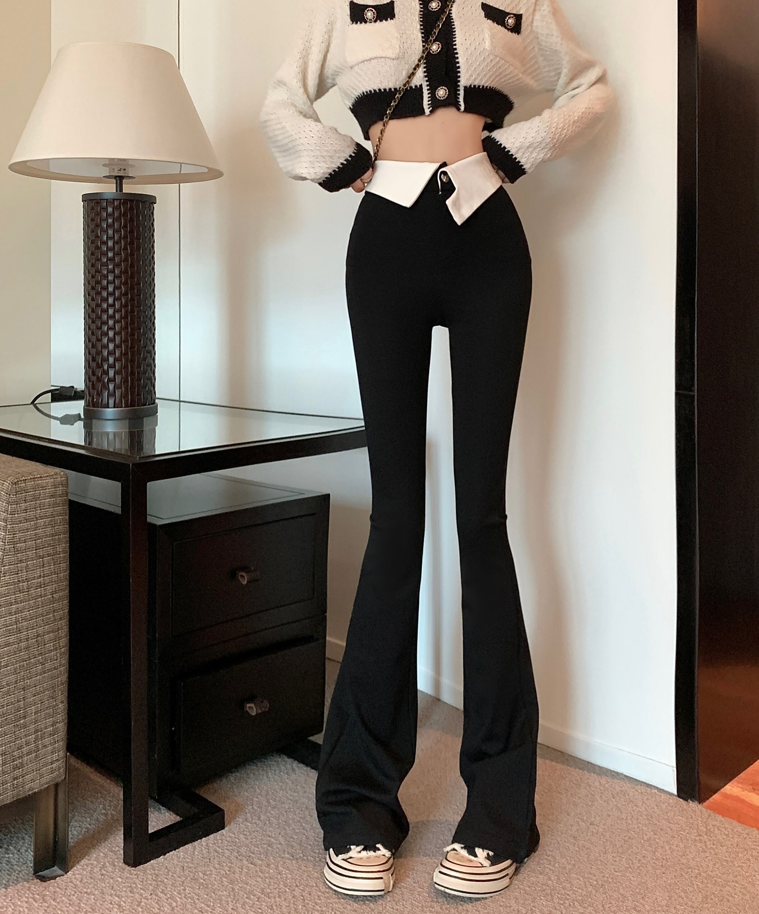 ウエスト黒フレアパンツ女性ワイド脚スリムレトロ Pantalones 春秋のズボンの服 ブラック スプリング 春物 オータム 秋物 ワイドレッグ ワイドパンツ asa77396423455