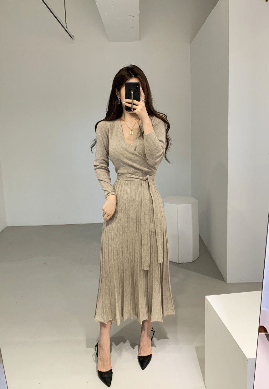 ワンピース V ネックスリム包帯ウエスト黒プリーツドレス女性ロングワイルドセクシーなニットドレスセーター秋固体レトロ ブラック オータム 秋物 Vネック ソリッドカラー asa5012384811