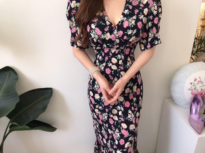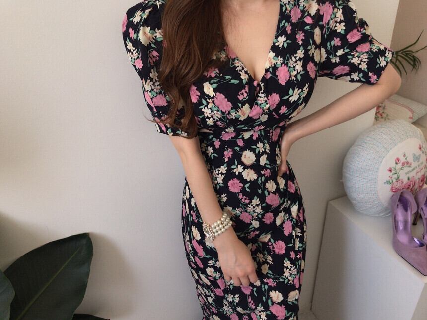 シックなレトロラップヒップ V 花柄半袖シフォンドレス女性の夏のローブ Vestidos ショート ハーフスリーブ サマー 夏物 asa68555899663