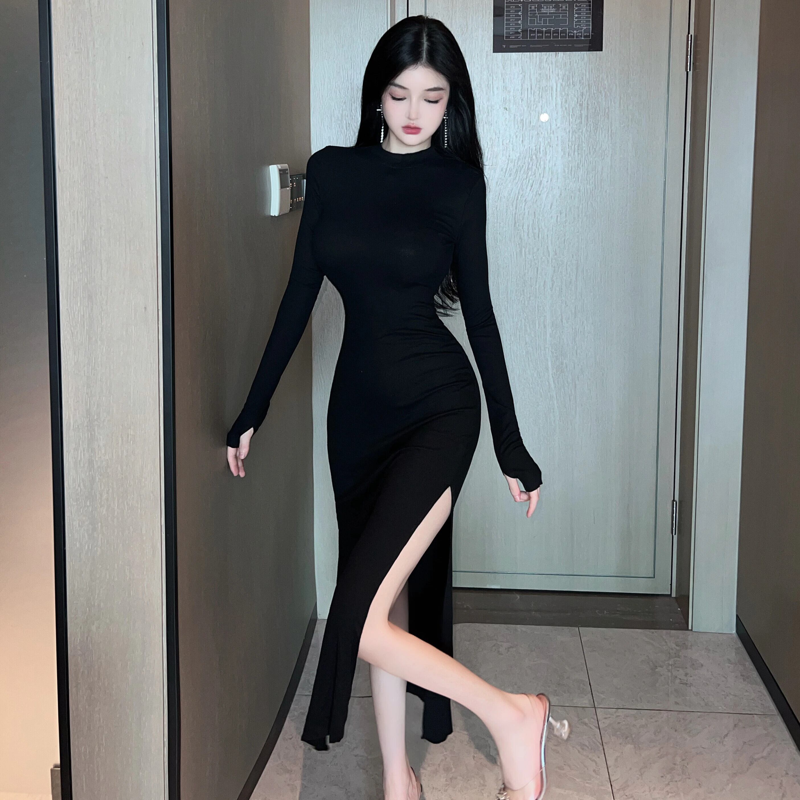 Vestidos セクシーな O ネック長袖黒のドレスの女性ワンピースシンプルなソリッドカラーのヒップバッグコットンワイルド ロング ブラック Oネック asa42483731415