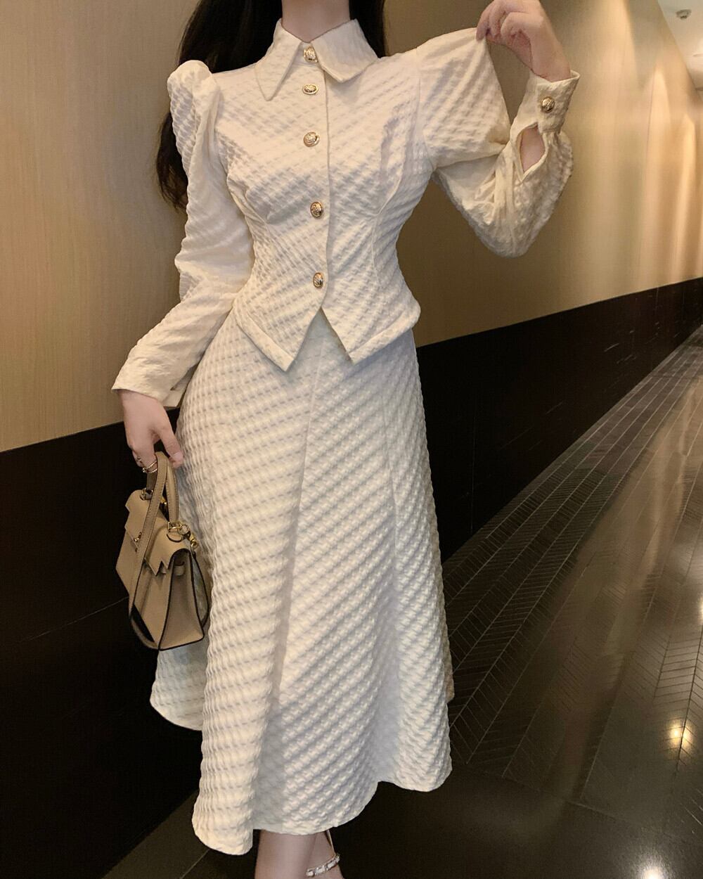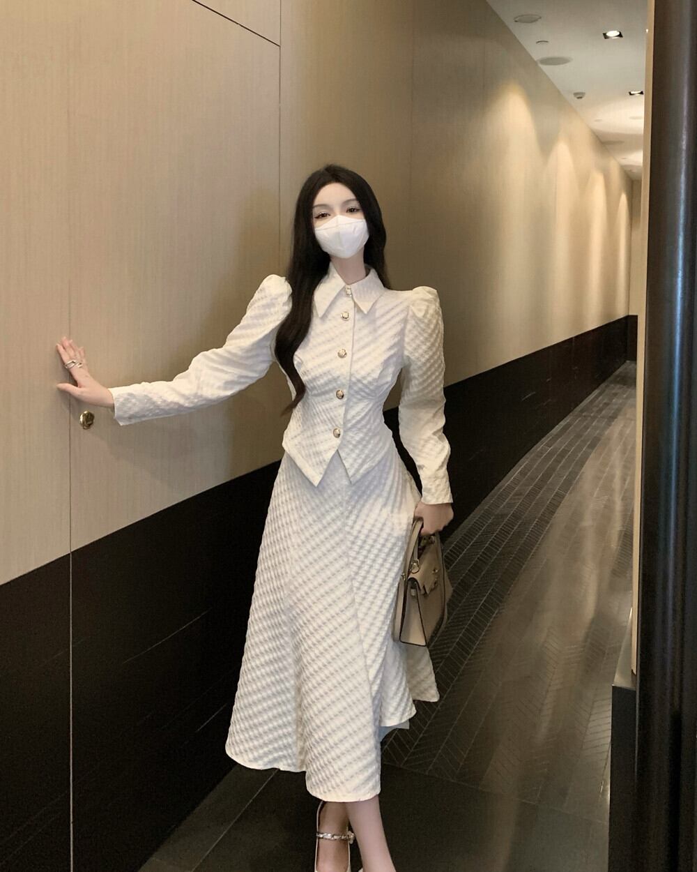 小さな香り白ジャカード不規則なジャケットスーツ 2 点セットレディース衣装ラペルパフ A ラインスカート秋シック ホワイト オータム 秋物 Aライン asa99818657971