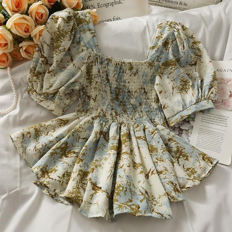 プリーツ スリム プリント バブルスリーブ 花柄 シャツ スクエア ブラウス レトロ 春 トップス フリル イレギュラー シャツ スプリング 春物 スクウェア asa51370020580