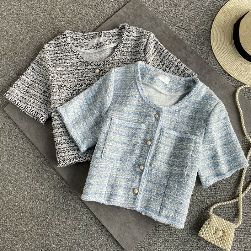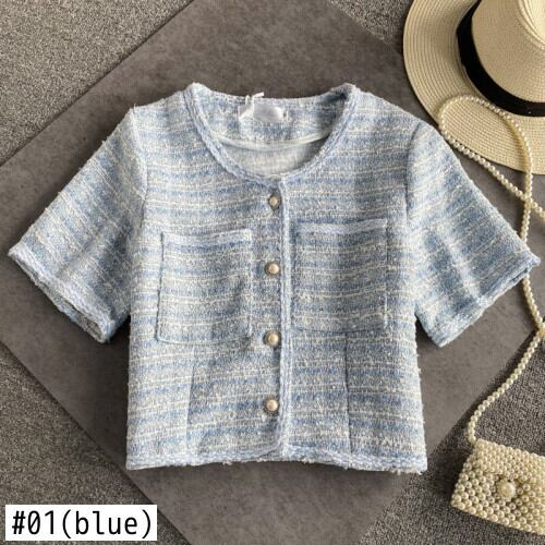 O ネック半袖コートチェック柄カーディガンブラウス女性シックなクロップトップス春ストライプジャケット Jaquetas Chaqueta シャツ ショート ハーフスリーブ スプリング 春物 asa66351891629