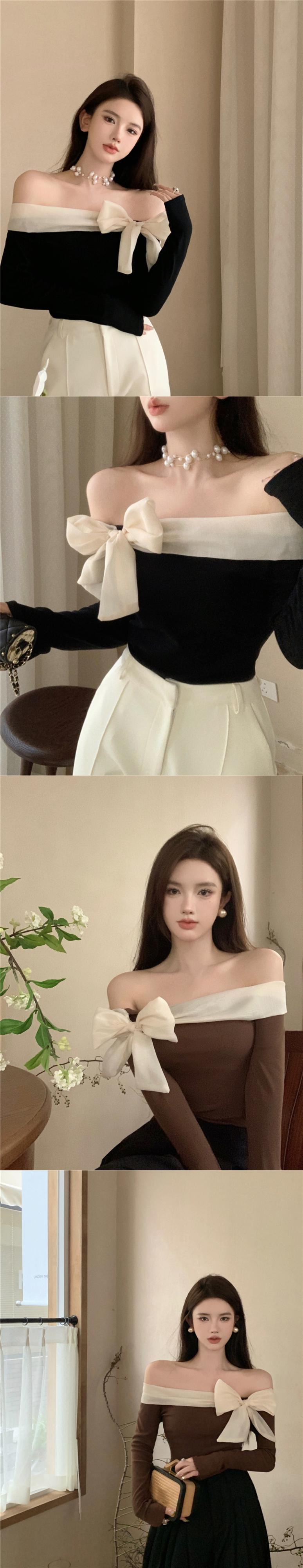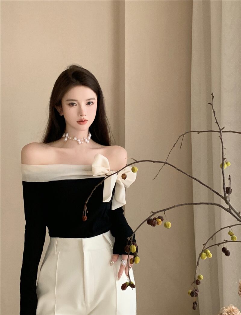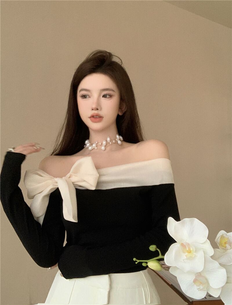 シックなオフショルダー長袖弓黒シャツ女性スリムレトロ Tシャツ Camisetas Ropa ニットトップ ロング ブラック リボン asa98515286588