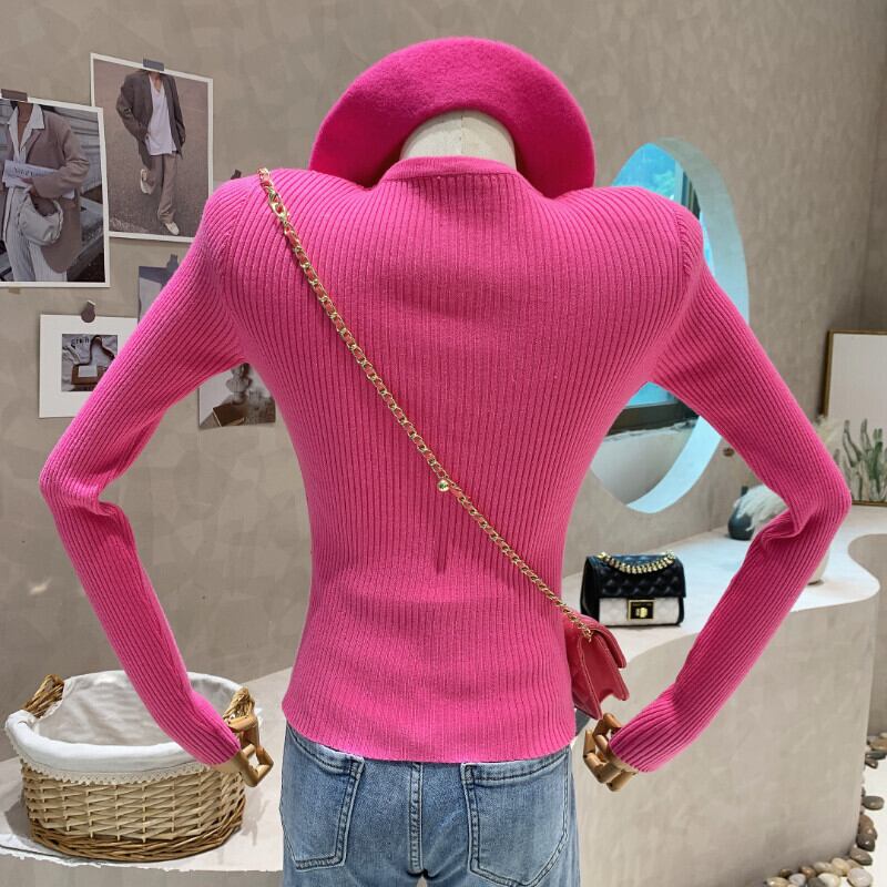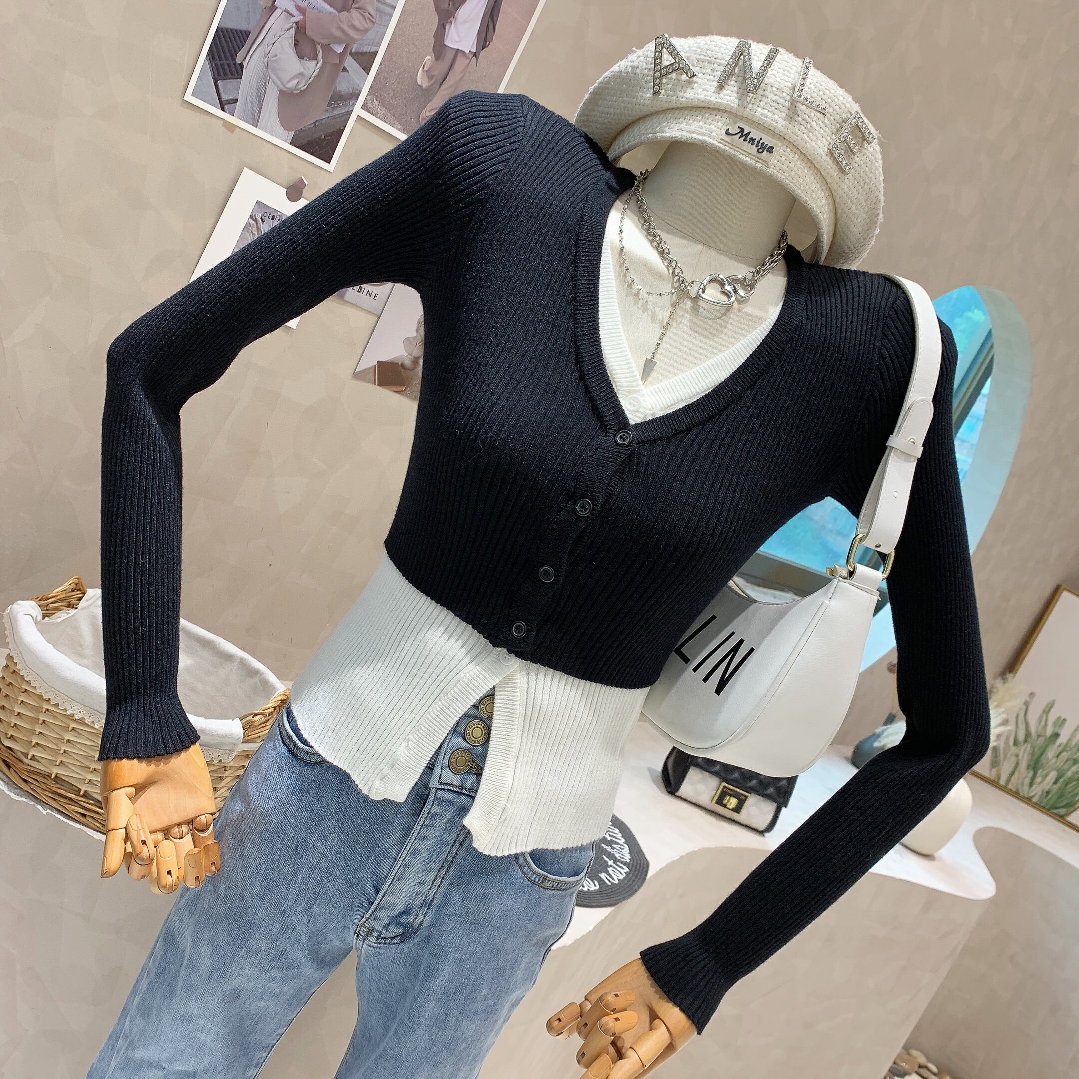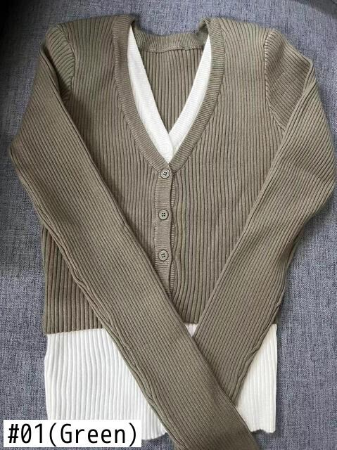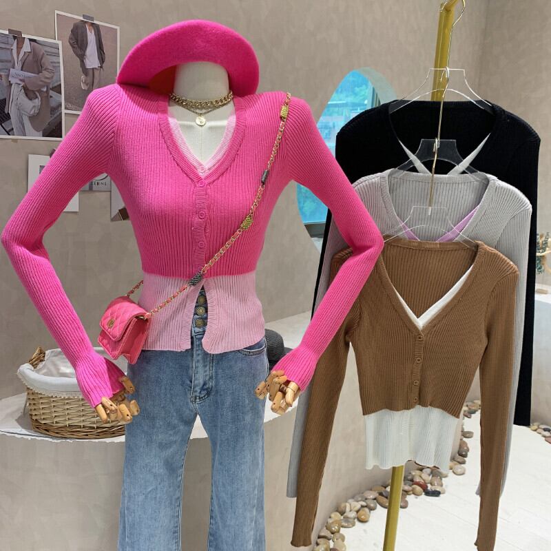 スリム V ネック シングルブレスト セーター フェイク ツー カーディガン プル ニット トップス 薄手のクロップド ジャケット ピンク カーディガン Vネック asa14250178879
