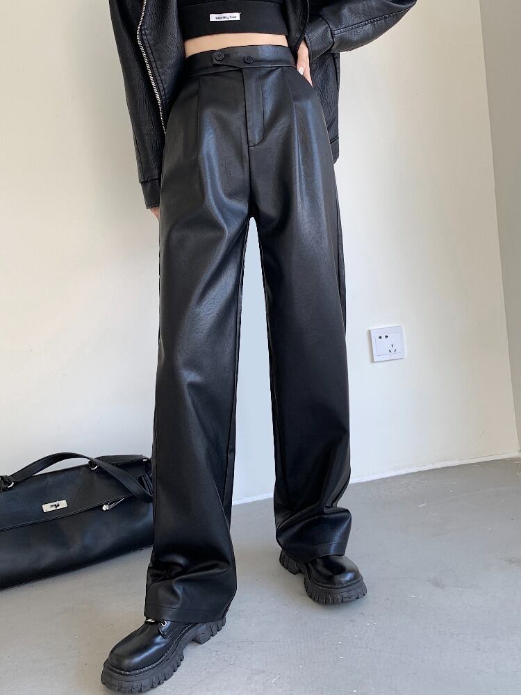 ストレートウエストワイド脚黒 PU レザーパンツ女性春ストリート Pantalones Y2k バギーパンツズボン ブラック スプリング 春物 ワイドレッグ ワイドパンツ asa46230962183