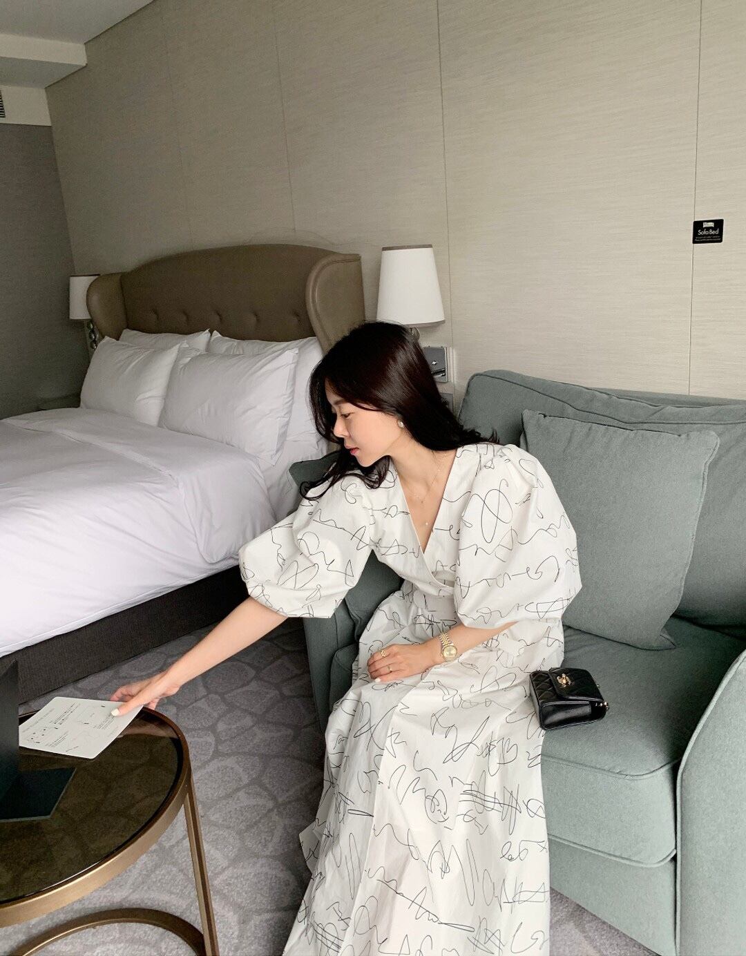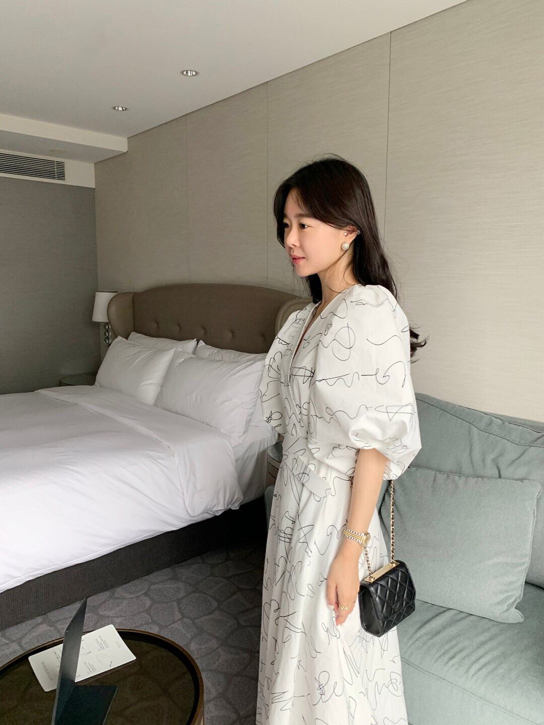 ミディ Vestidos デ V ネックウエスト大スイングランタンスリーブホワイトグラフィティドレス女性ルーズショートミニマリズム Vネック asa71962394742