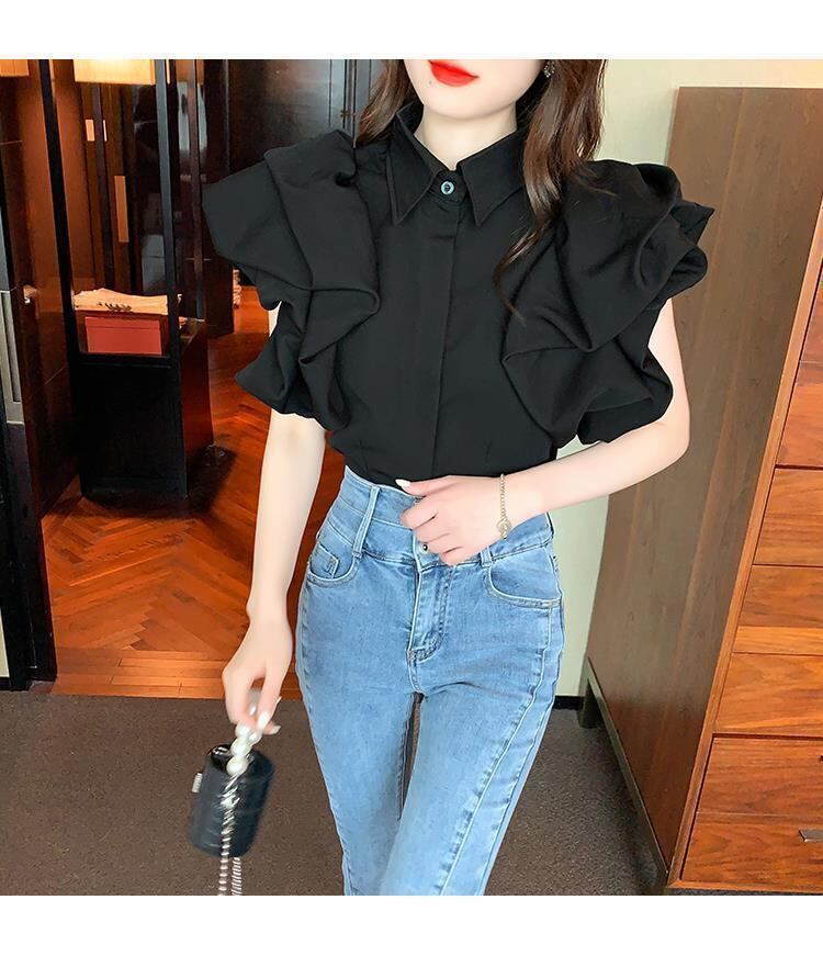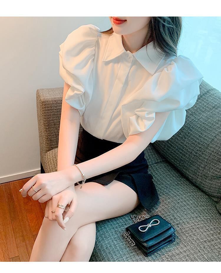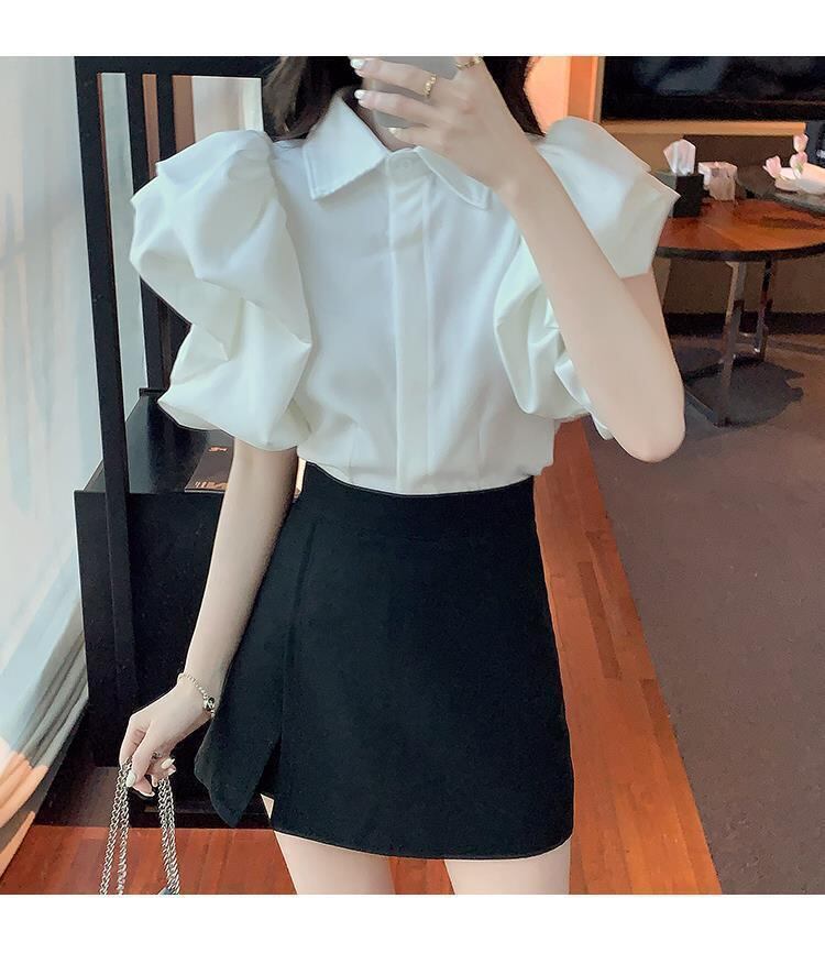 女性ブラウストップス半袖白ターンダウン襟 OL シャツゆるいフェミニンな黒提灯クロップブラウスシャツ ショート ホワイト ブラック ハーフスリーブ asa66430822289
