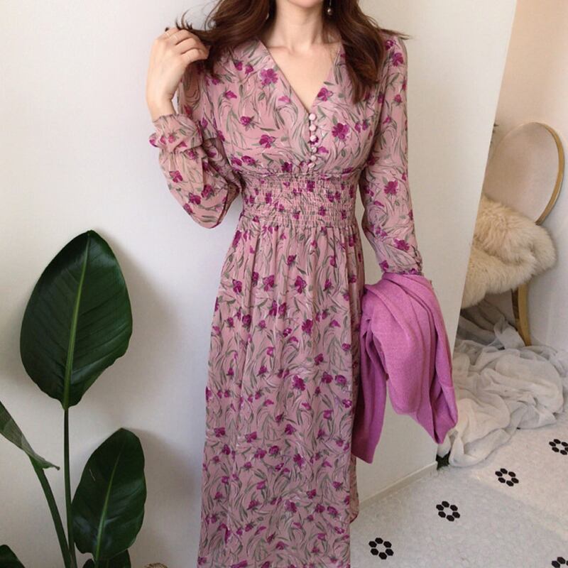 スリム A ライン ビーチ スタイル V ネック シングル ブレスト プリーツ ウエスト フレア スリーブ花ドレス女性 Vestido ローブ シフォン ドレス フレアスリーブ 花柄 Vネック Aライン asa67687573660