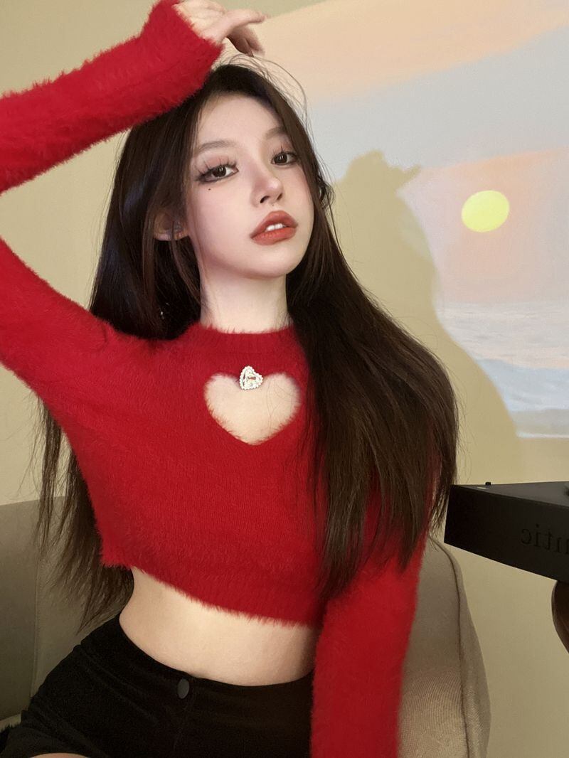 セクシーな中空クロップトップスプルオーバージャンパー O ネックピンクの愛のセーターの女性のセータースリムワイルドニットソリッド Oネック ソリッドカラー asa83156236815