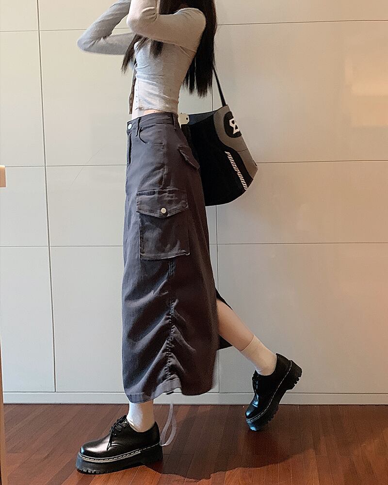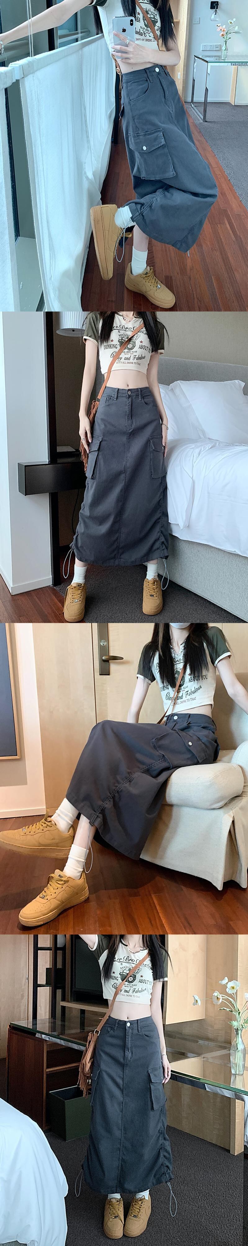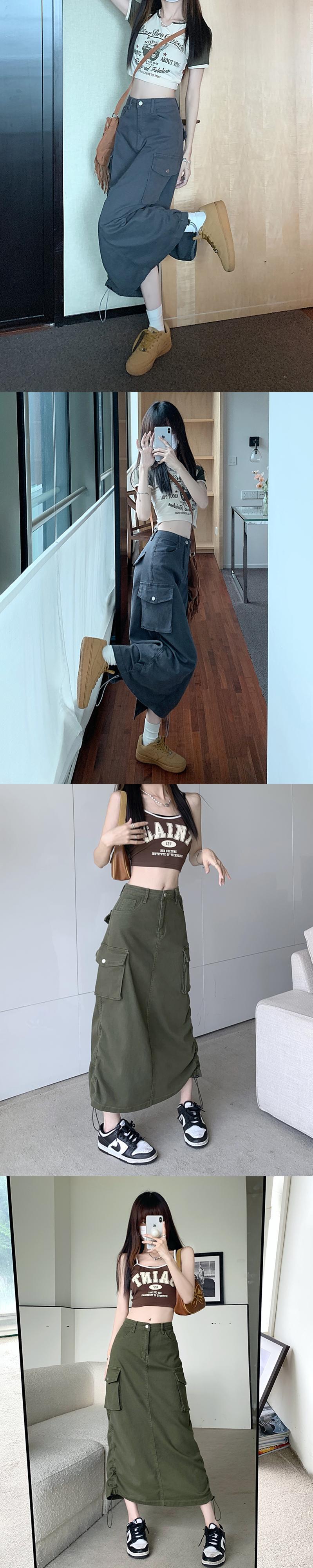 アーミーグリーン巾着デニムスカートウエストスリムカーゴ Y2k ペチコートロングスカート女性 Faldas Largas Midi asa9720925900