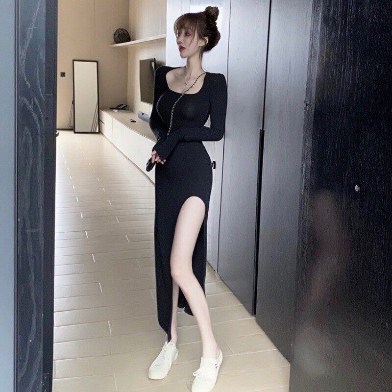 シックな気質ワイルドスリムミッドレングスセクシーなスプリット O ネック長袖黒のドレスの女性の綿 Vestidos デ ロング ブラック コットン Oネック asa48589615346